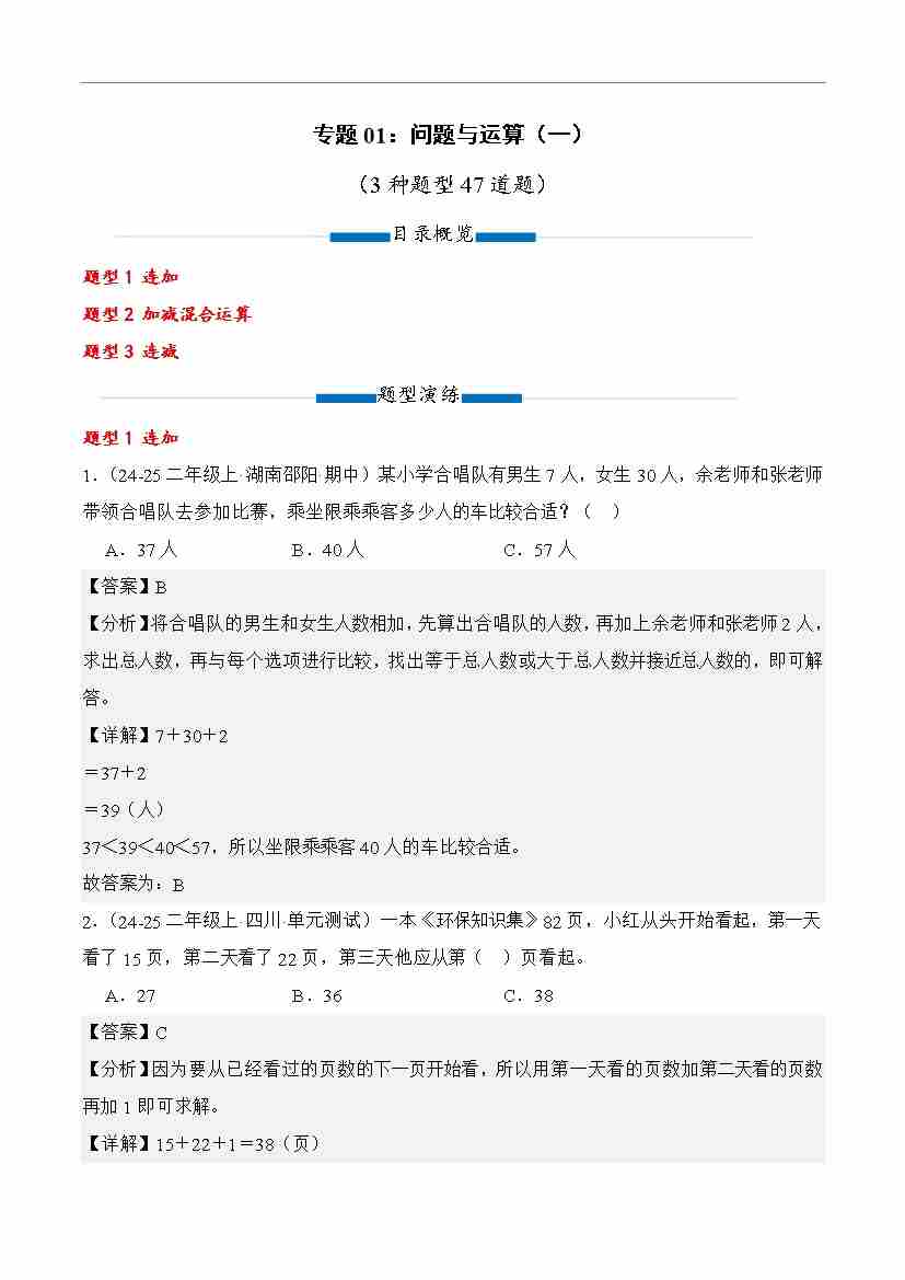 专题01:问题与运算(一)(期中专项训练)二年级数学上学期(冀教版)(原卷版)