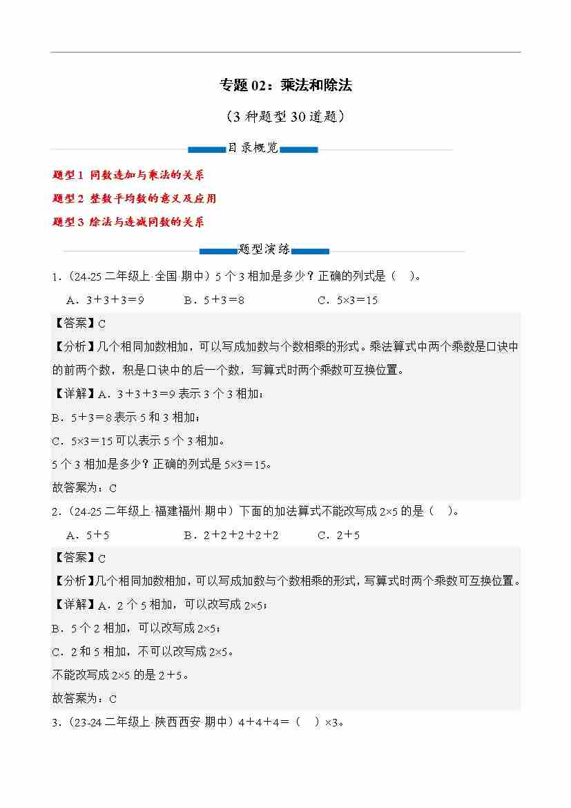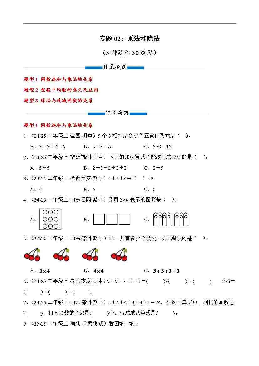 专题02:乘法和除法(期中专项训练)二年级数学上学期(冀教版)(原卷版)