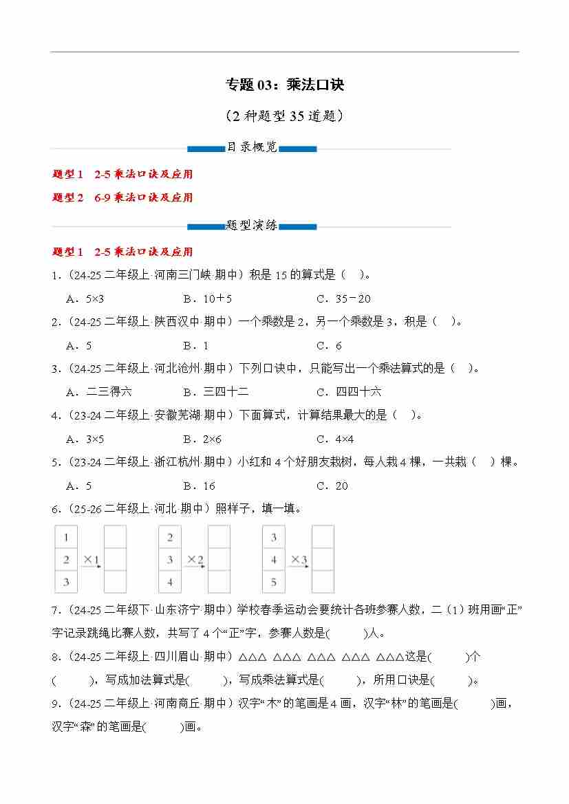 专题03:乘法口诀(期中专项训练)二年级数学上学期(冀教版)(原卷版)