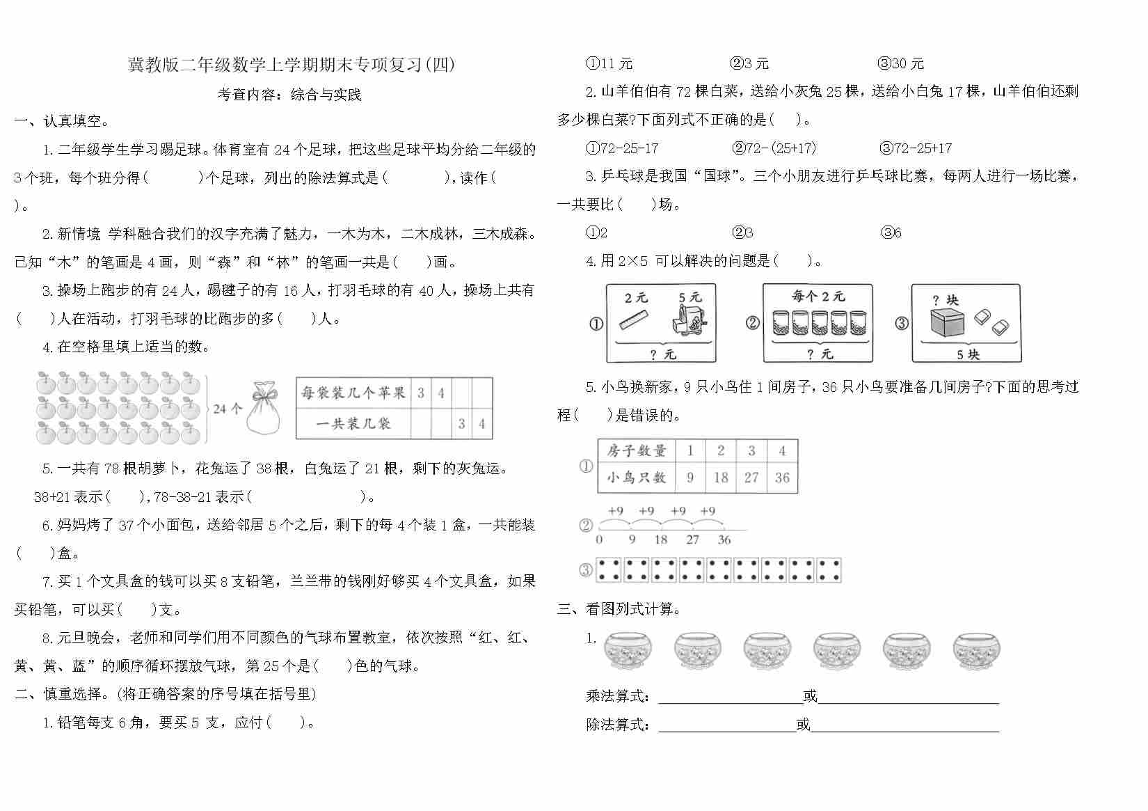 冀教版 二年级数学上学期期末专项复习(四)(含答案)