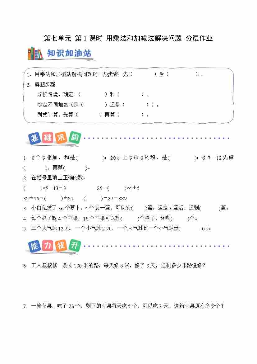 第七单元第1课时 用乘法和加减法解决问题(分层作业)数学青岛五四版二年级上册(新教材)