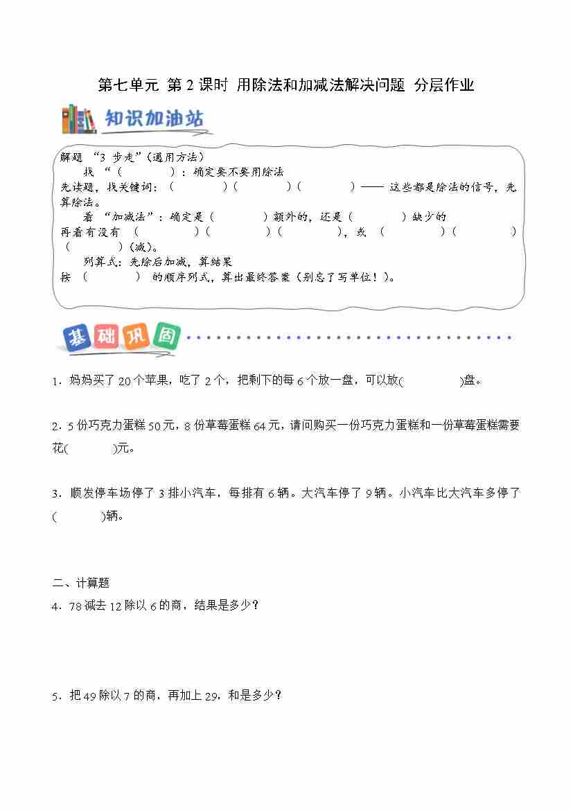 第七单元第2课时 用除法和加减法解决问题(分层作业)数学青岛五四版二年级上册(新教材)