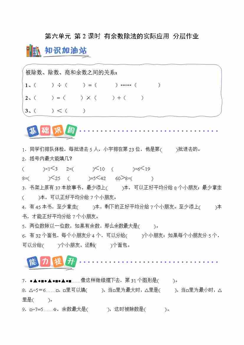 第六单元第2课时 有余数除法的实际应用(分层作业)数学青岛五四版二年级上册(新教材)