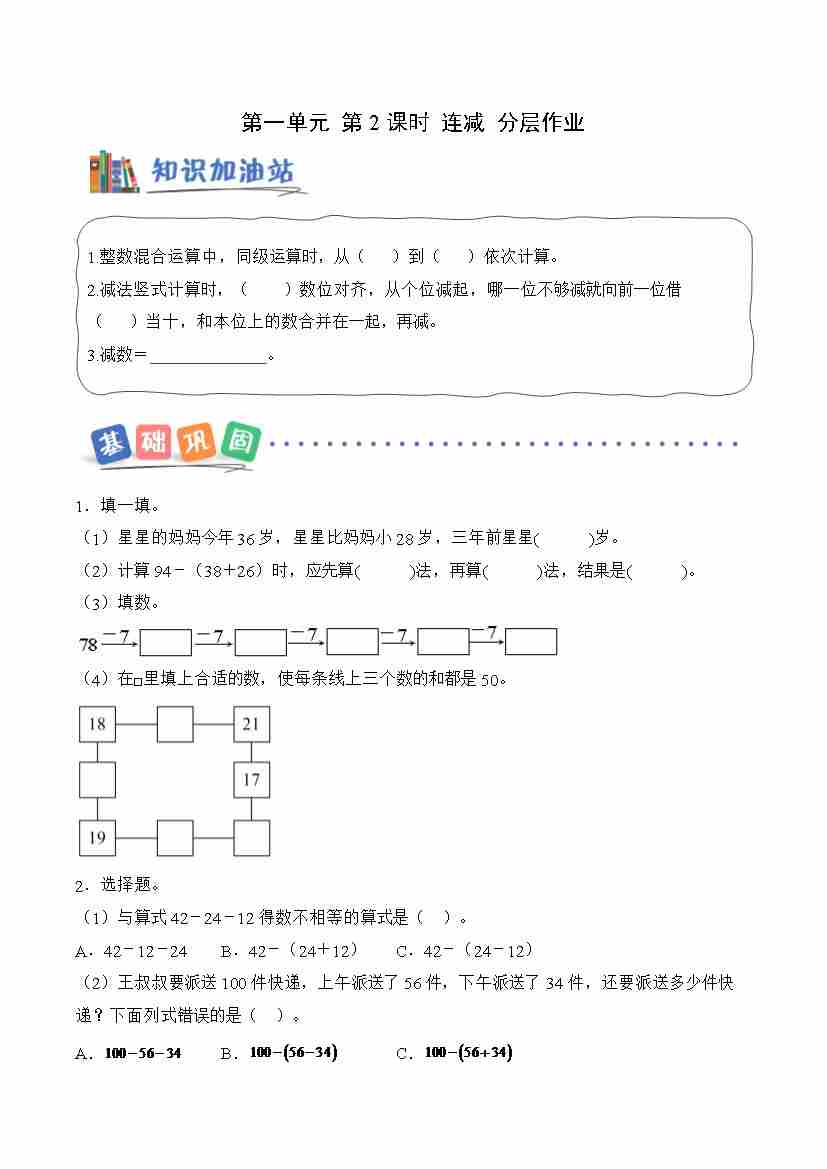 第一单元 第3课时 连减(分层作业)数学冀教版二年级上册(新教材)