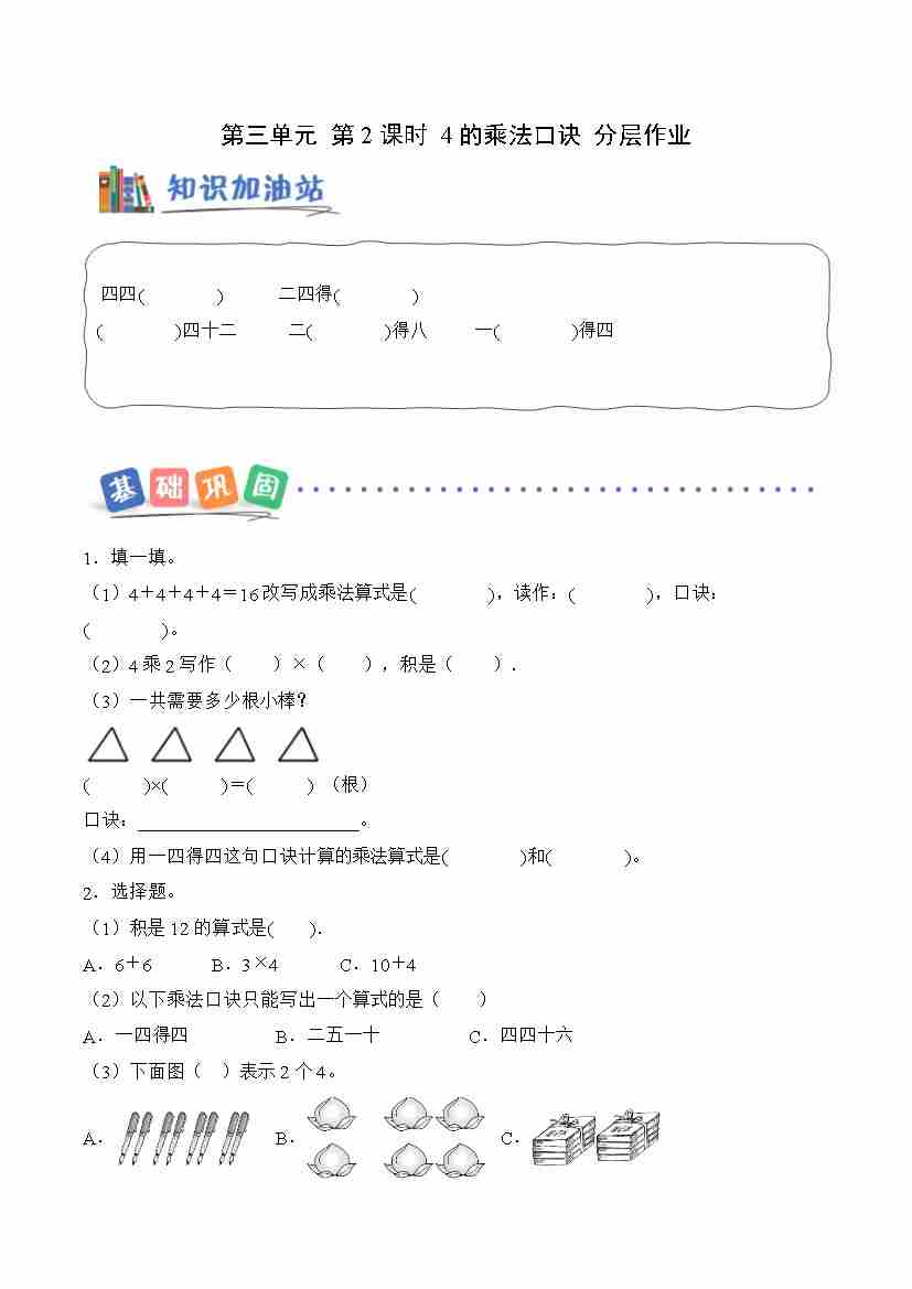 第三单元 第2课时 4的乘法口诀(分层作业)数学冀教版二年级上册(新教材)