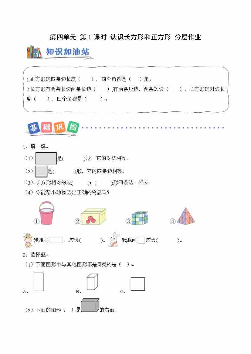第四单元 第1课时 认识长方形和正方形(分层作业)数学冀教版二年级上册(新授课)