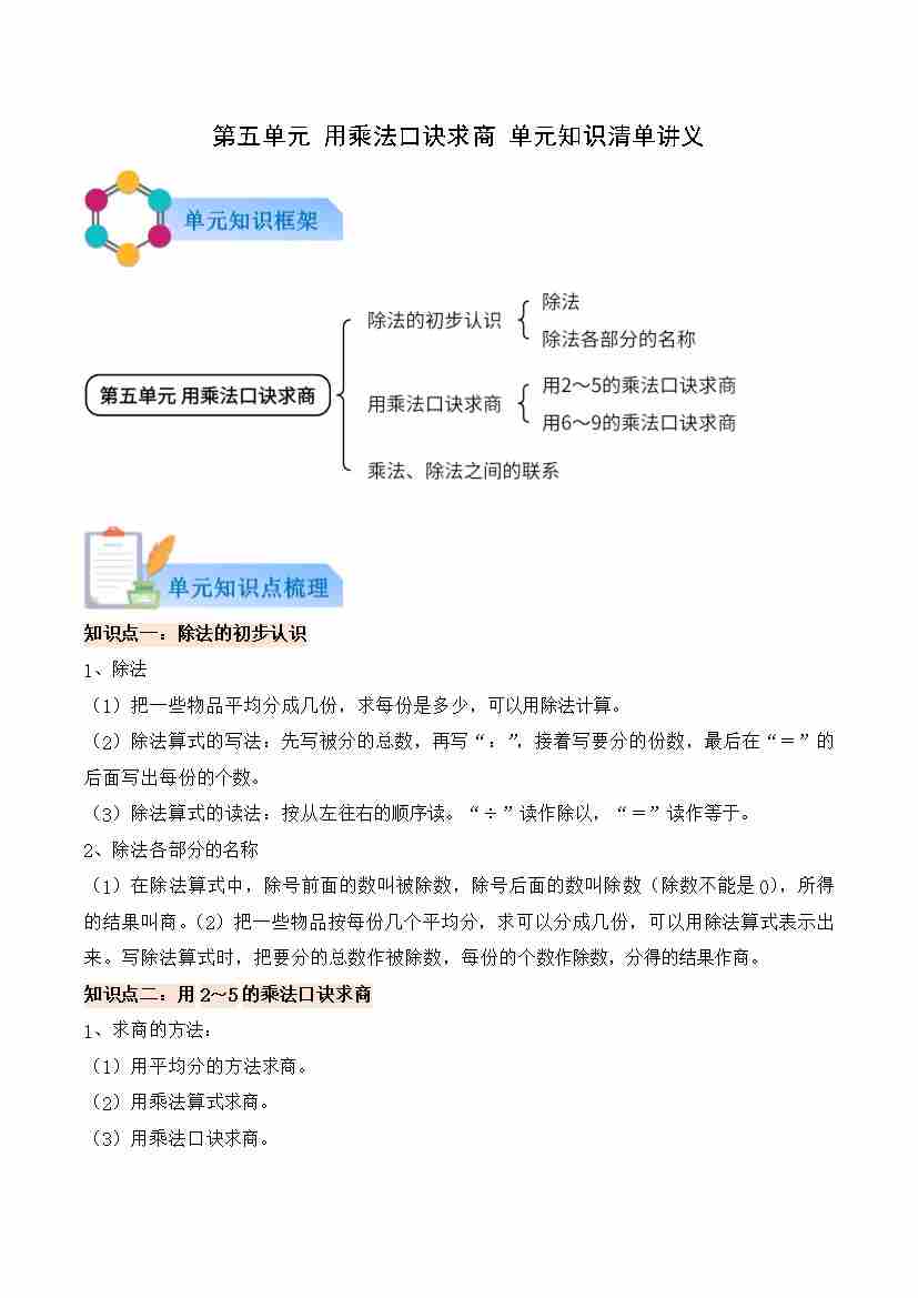 第五单元 用乘法口诀求商(知识清单)数学冀教版二年级上册 (解析版)