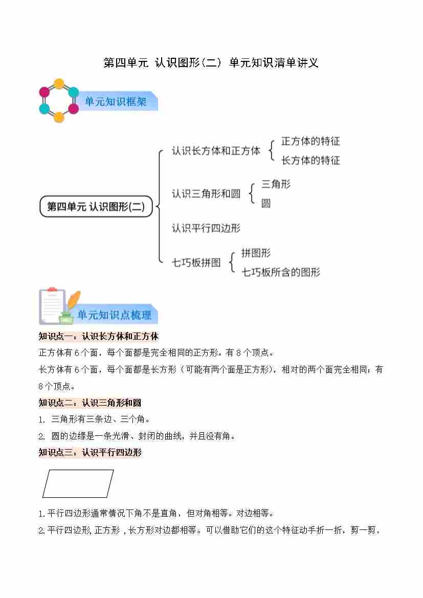 第四单元 认识图形(二)(知识清单)数学冀教版二年级上册 (解析版)