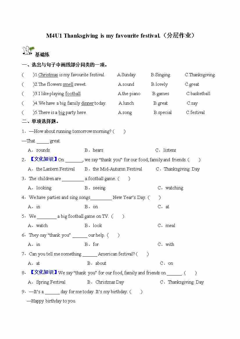 M4U1 Thanksgiving is my favourite festival.(分层作业)英语外研版三起六年级上册