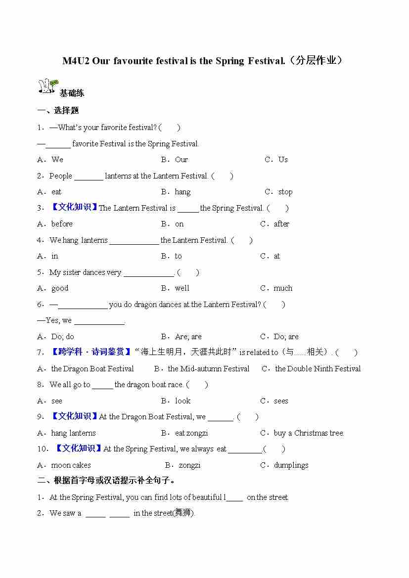 M4U2 Our favourite festival is the Spring Festival.(分层作业)英语外研版三起六年级上册