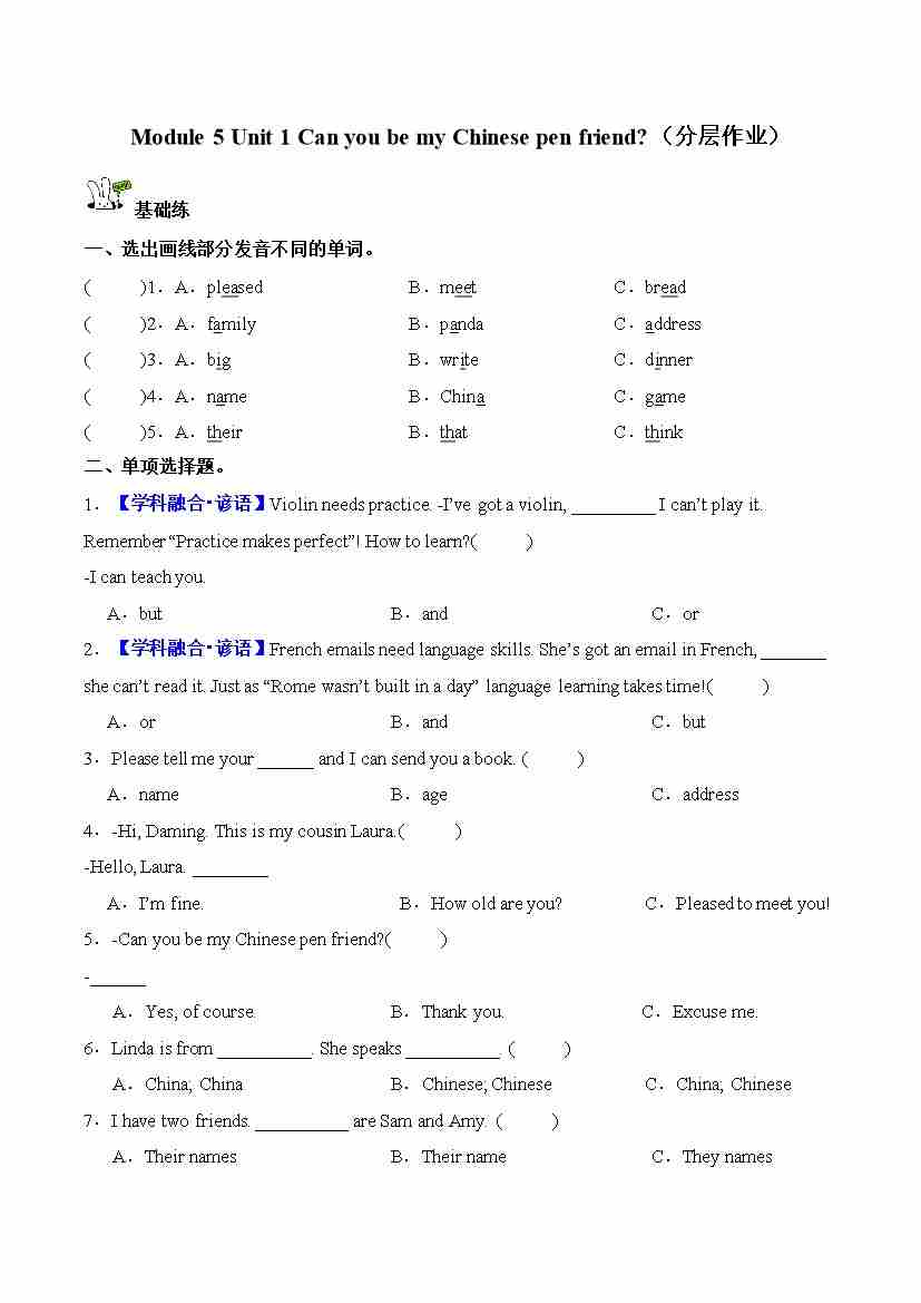 Module 5 Unit 1 Can you be my Chinese pen friend(分层作业)英语外研版三起六年级上册
