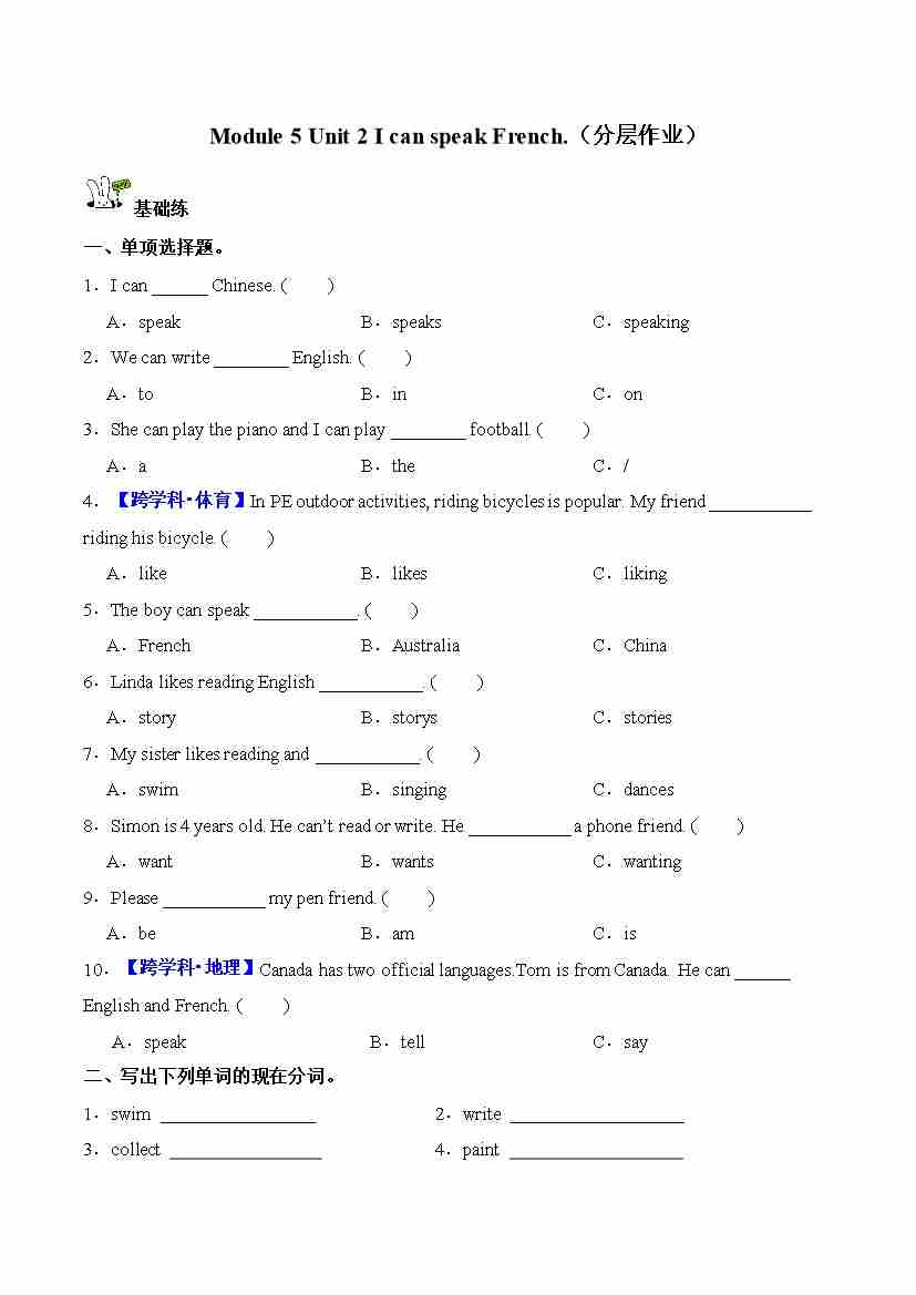 Module 5 Unit 2 I can speak French.(分层作业)英语外研版三起六年级上册