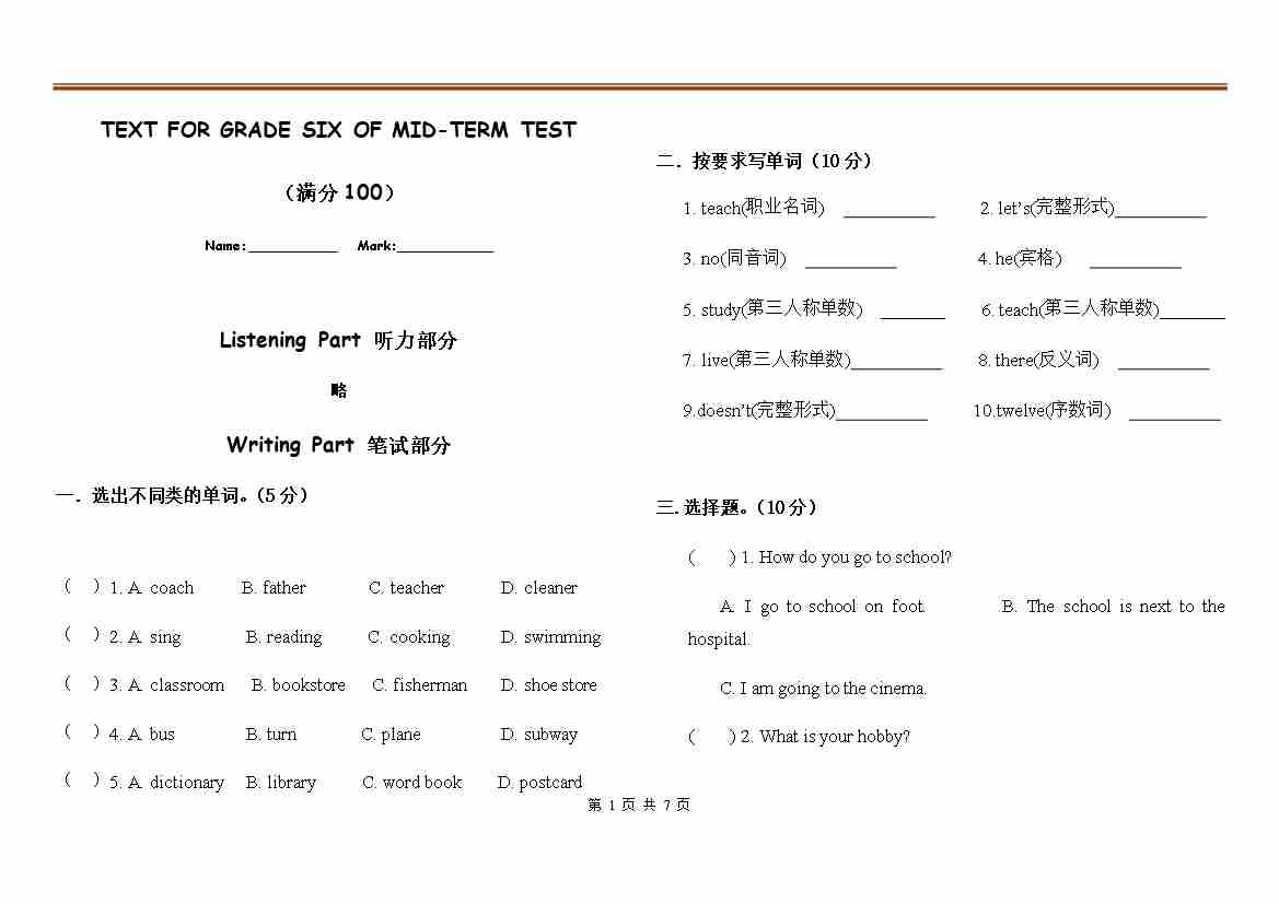 16 PEP秋季课程六年级第十六讲教案 期末测试