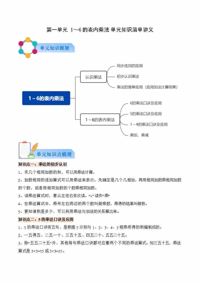 第一单元 1~6的表内乘法(知识清单)数学苏教版二年级上册(解析版)