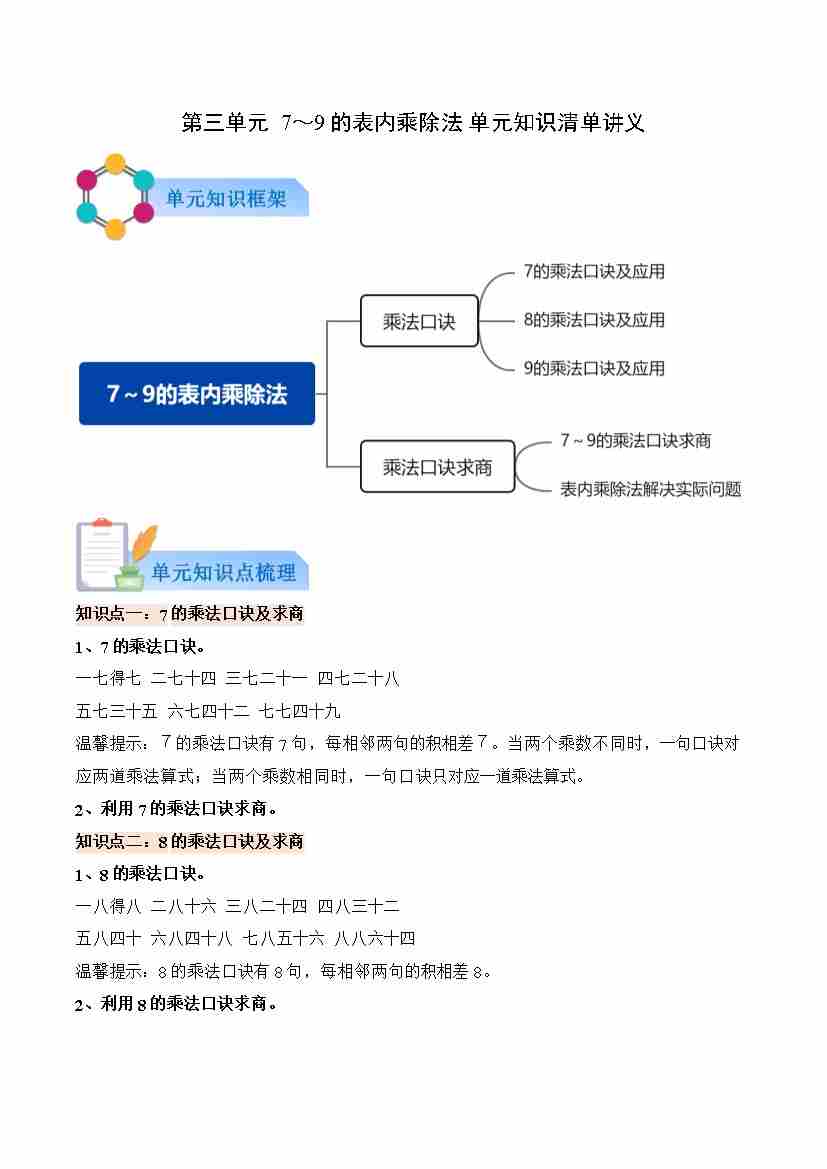 第三单元 7~9的表内乘除法(知识清单)数学苏教版二年级上册(原卷版)