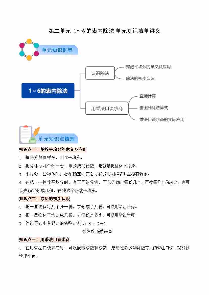 第二单元 1~6的表内除法(知识清单)数学苏教版二年级上册(解析版)