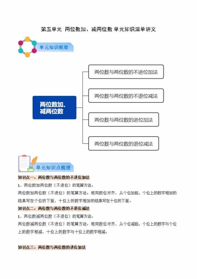 第五单元 两位数加、减两位数(知识清单)数学苏教版二年级上册(原卷版)