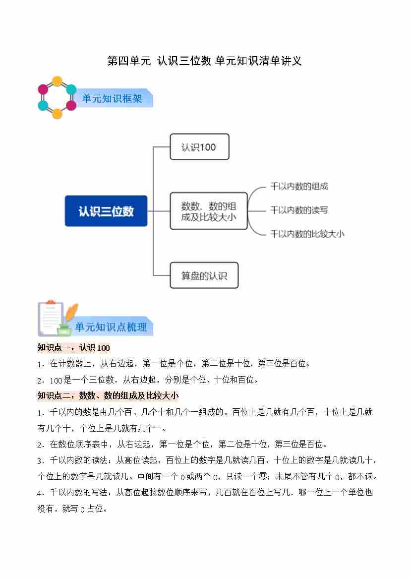 第四单元 认识三位数(知识清单)数学苏教版二年级上册(原卷版)