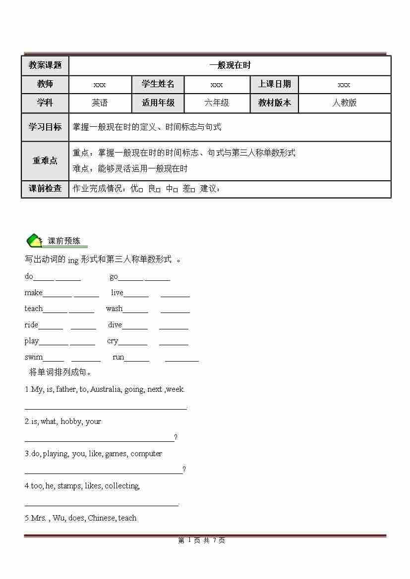 7 PEP秋季课程六年级第七讲教案 Recycle 1——Unit 1~Unit 3总复习