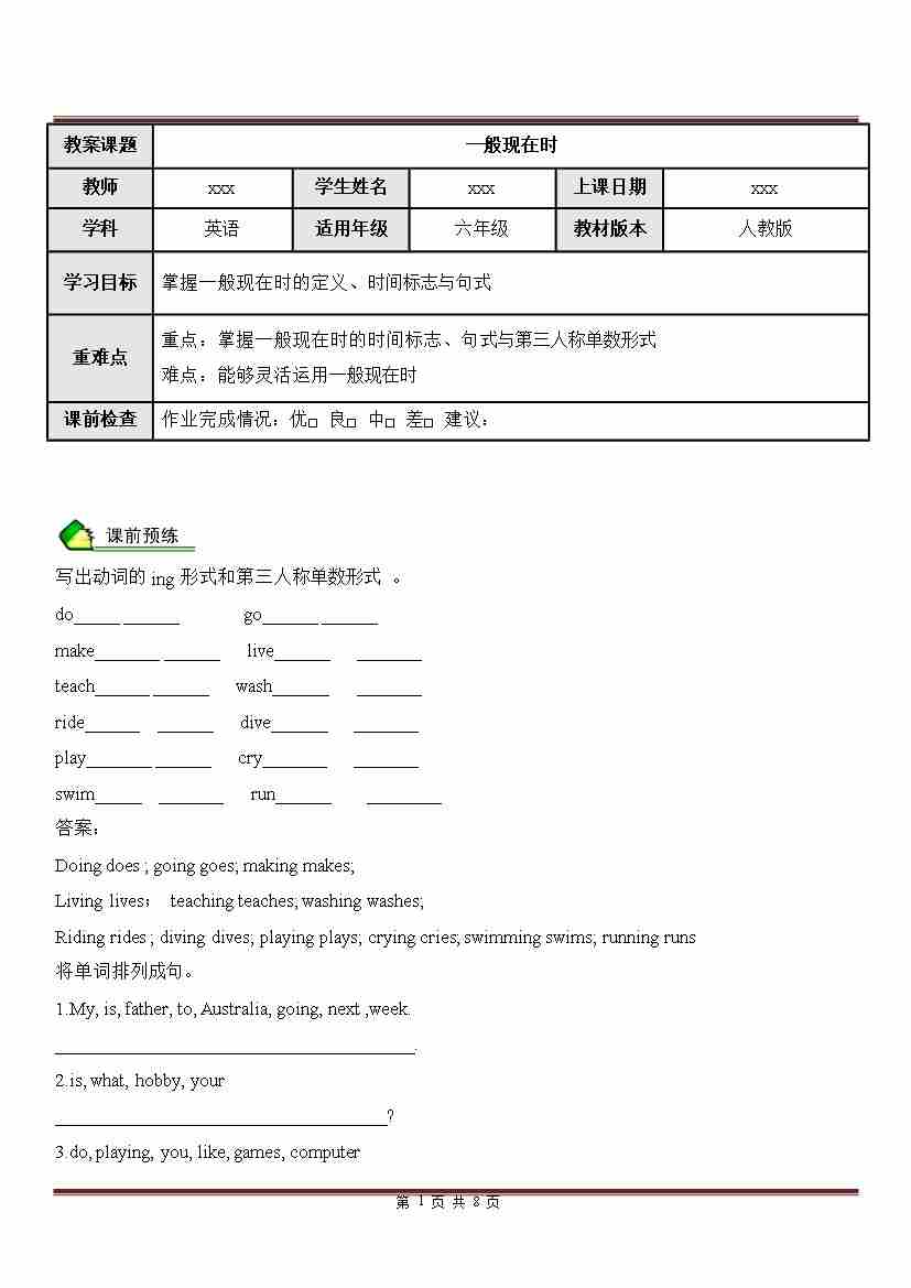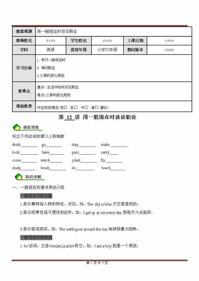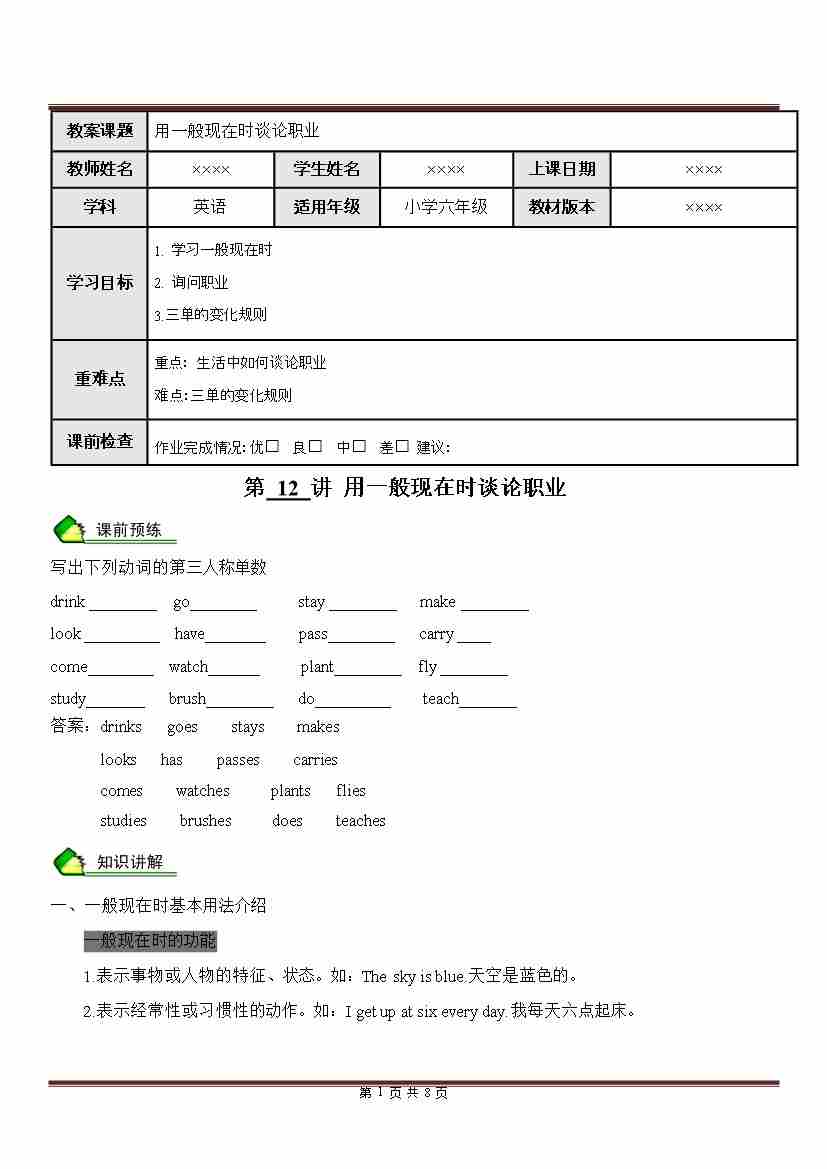 12 PE1秋季课程六年级第十二讲教案 用一般现在时谈论职业(教师版)