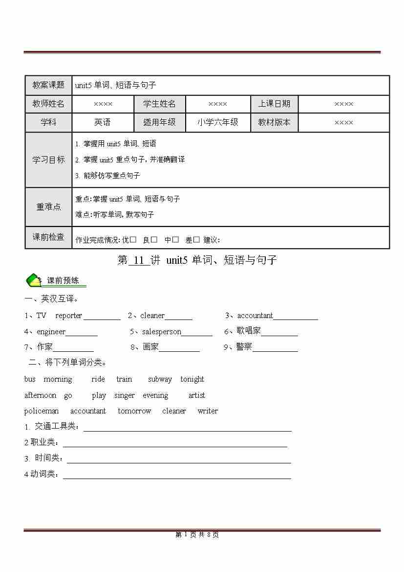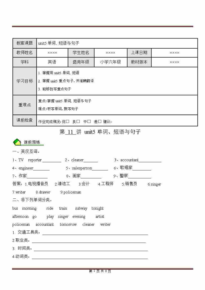 11 PEP秋季课程六年级第十一讲教案 unit5 what does he do(教师版)