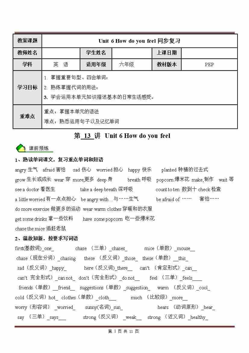 13 PEP秋季课程六年级第13讲教案Unit 6 How do you feel同步复习