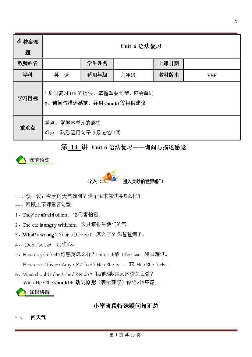 14 PEP秋季课程六年级第14讲教案 询问与描述感觉(教师版)