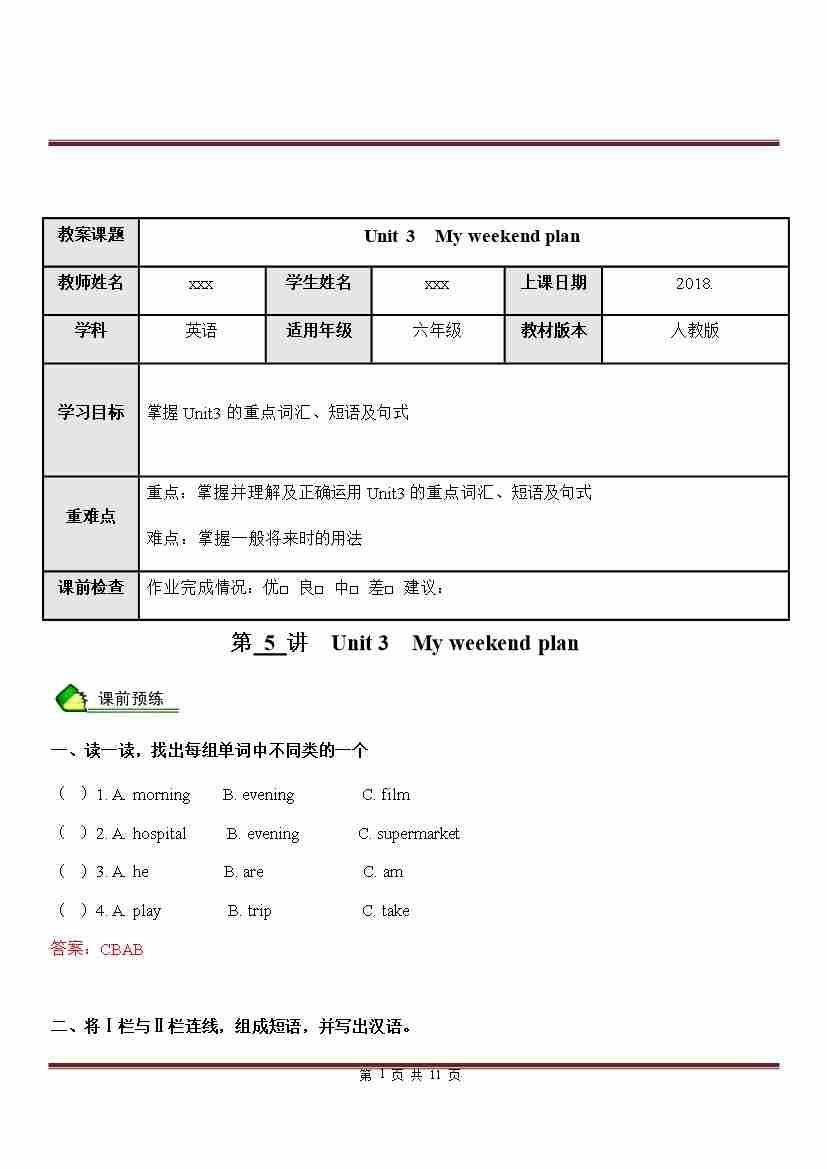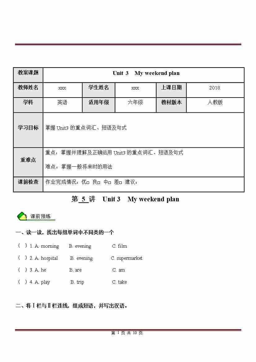 5 PEP秋季课程六年级第五讲教案 Unit 3 My weekend plan(教师版)