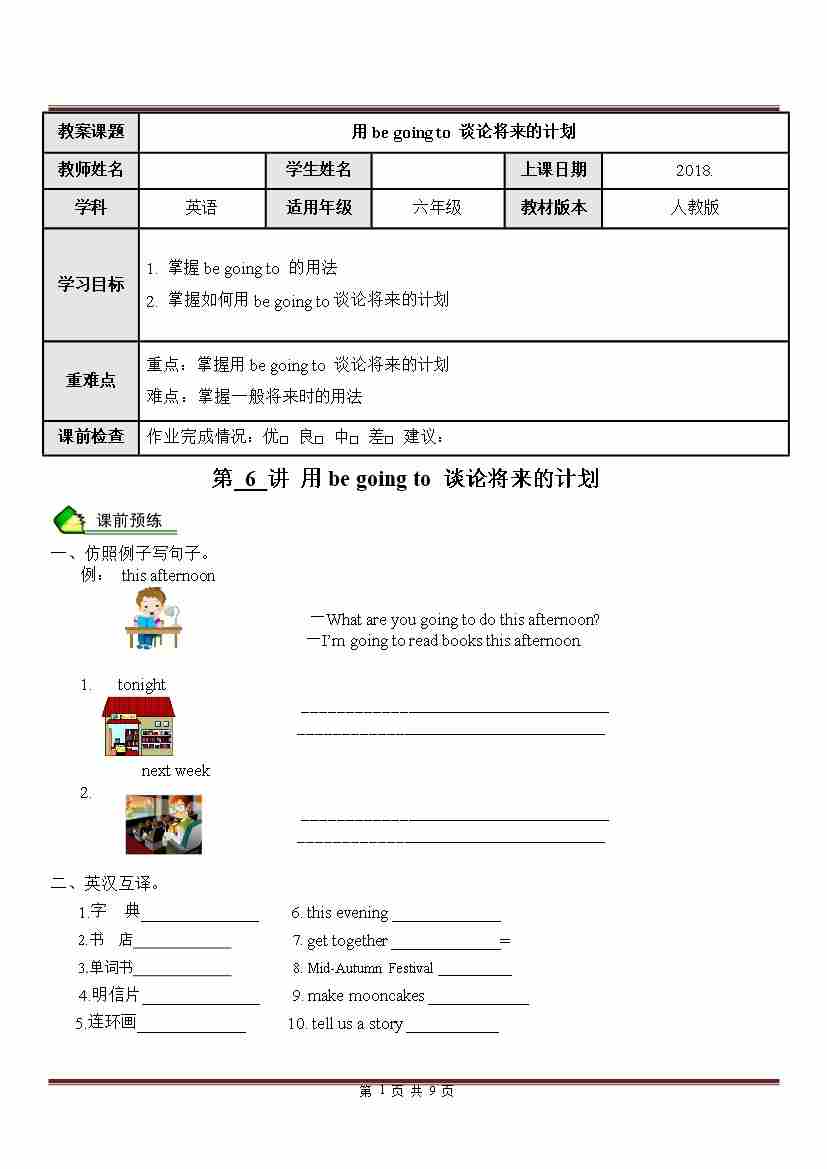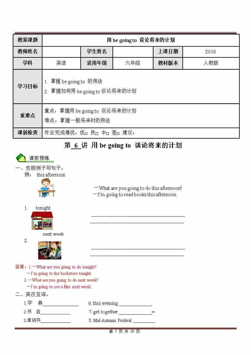 6 PEP秋季课程六年级第六讲教案 用be going to 谈论将来的计划(教师版)