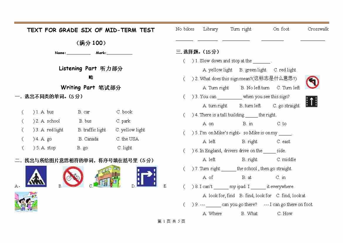 8 PEP秋季课程六年级第八讲教案 期中测试(教师版)