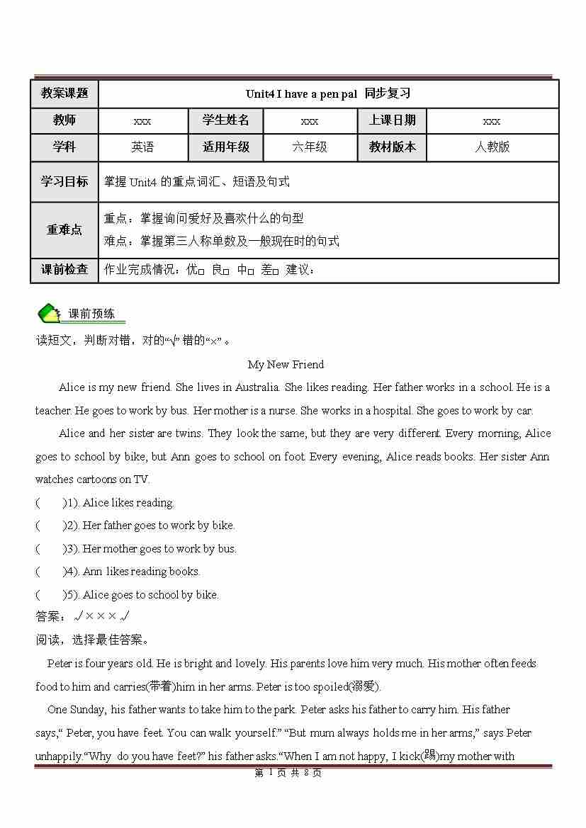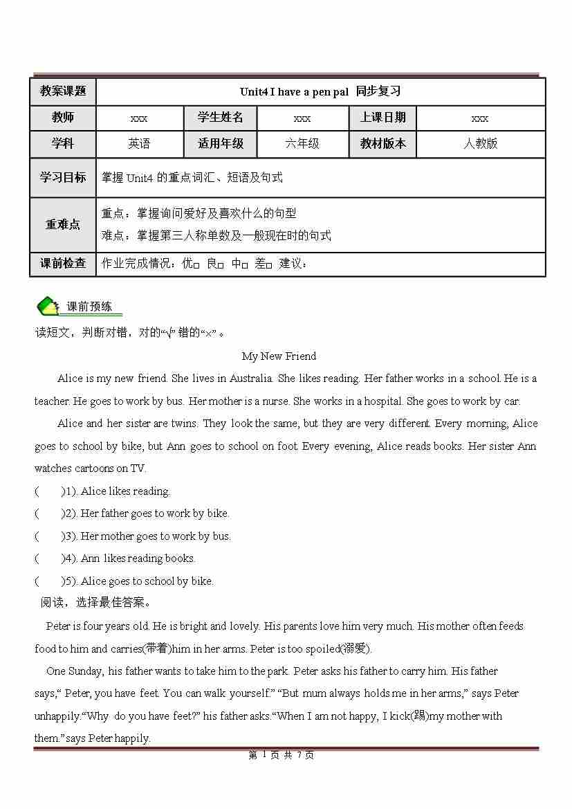 9 PEP秋季课程六年级第九讲教案Unit 4 i have a pen pal