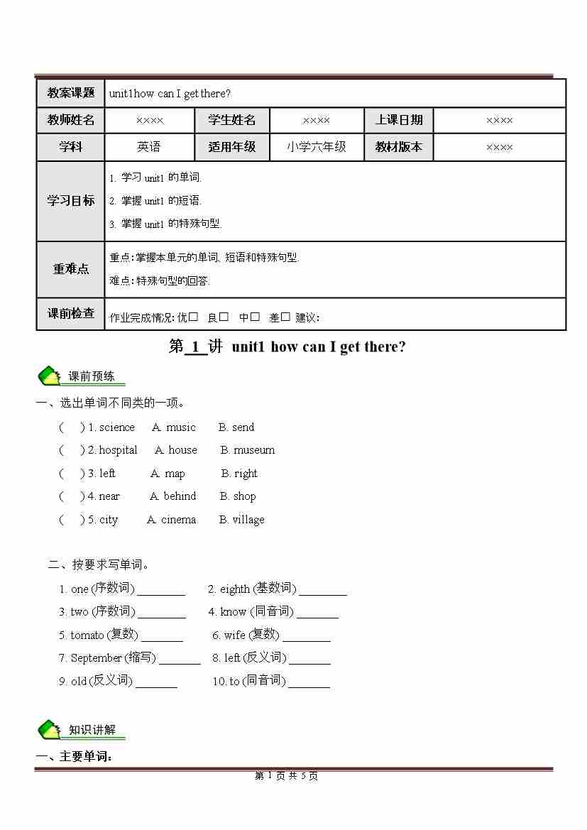 1 PEP秋季课程六年级第一讲教案 unit1 how can I get there