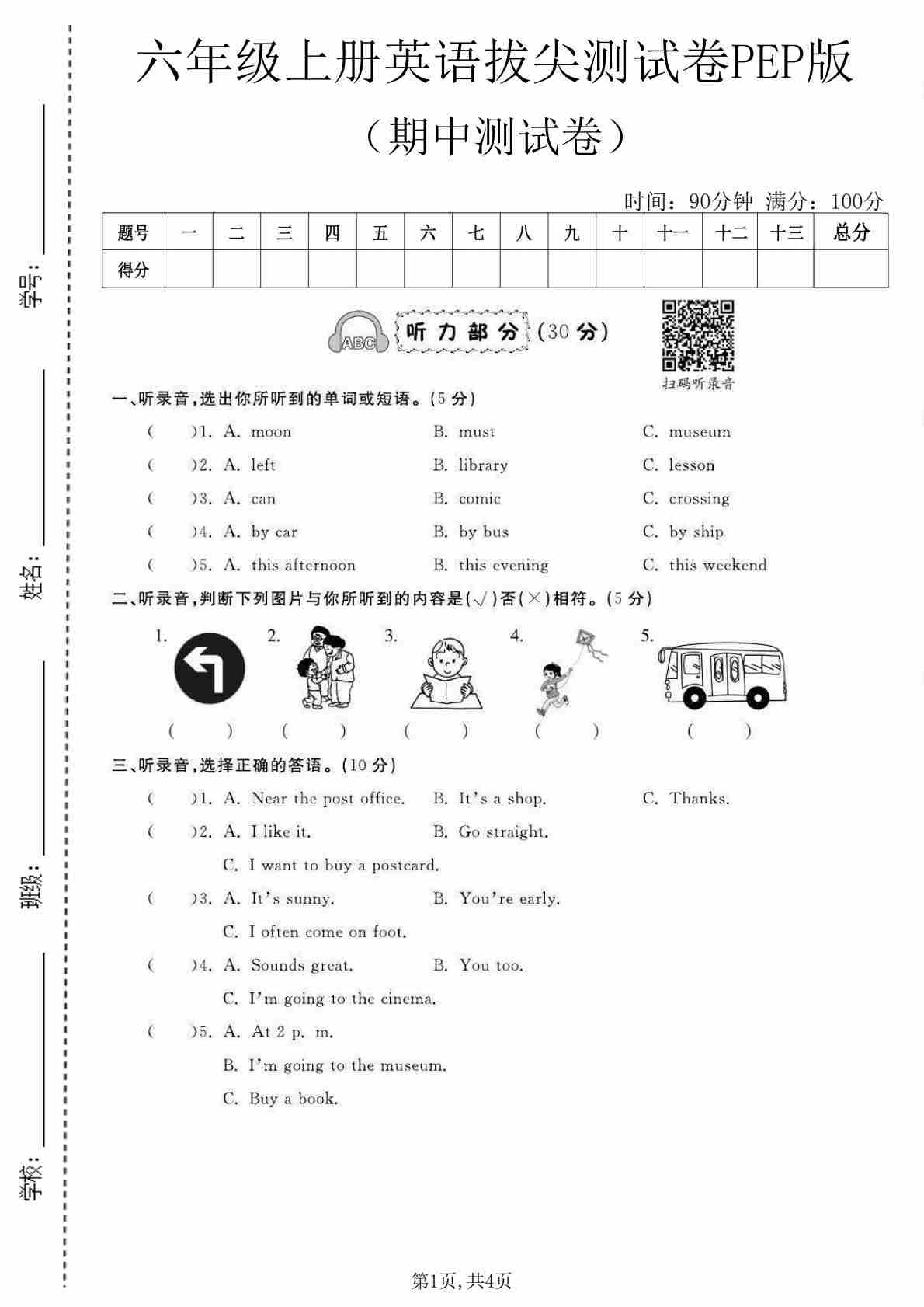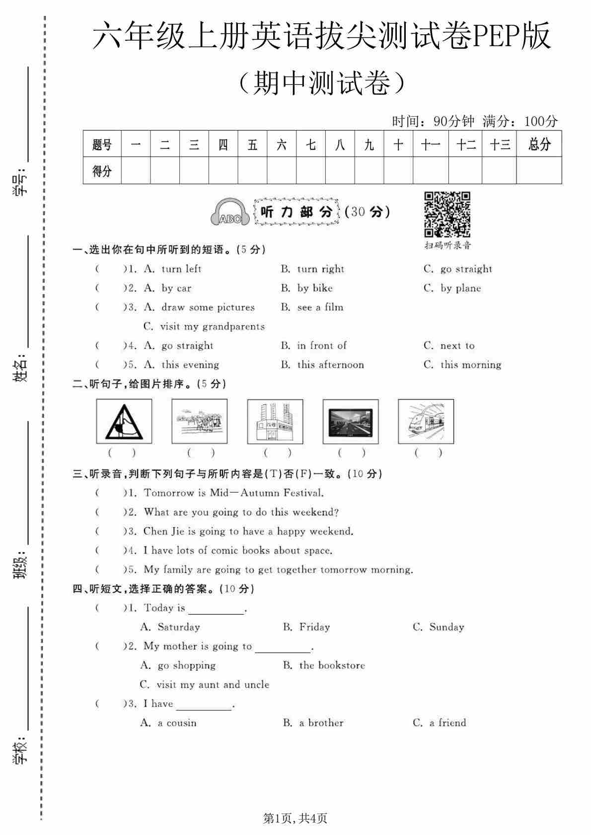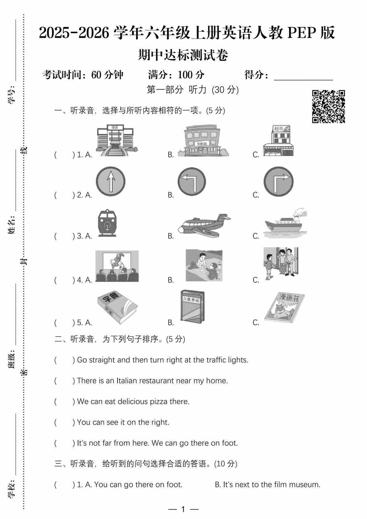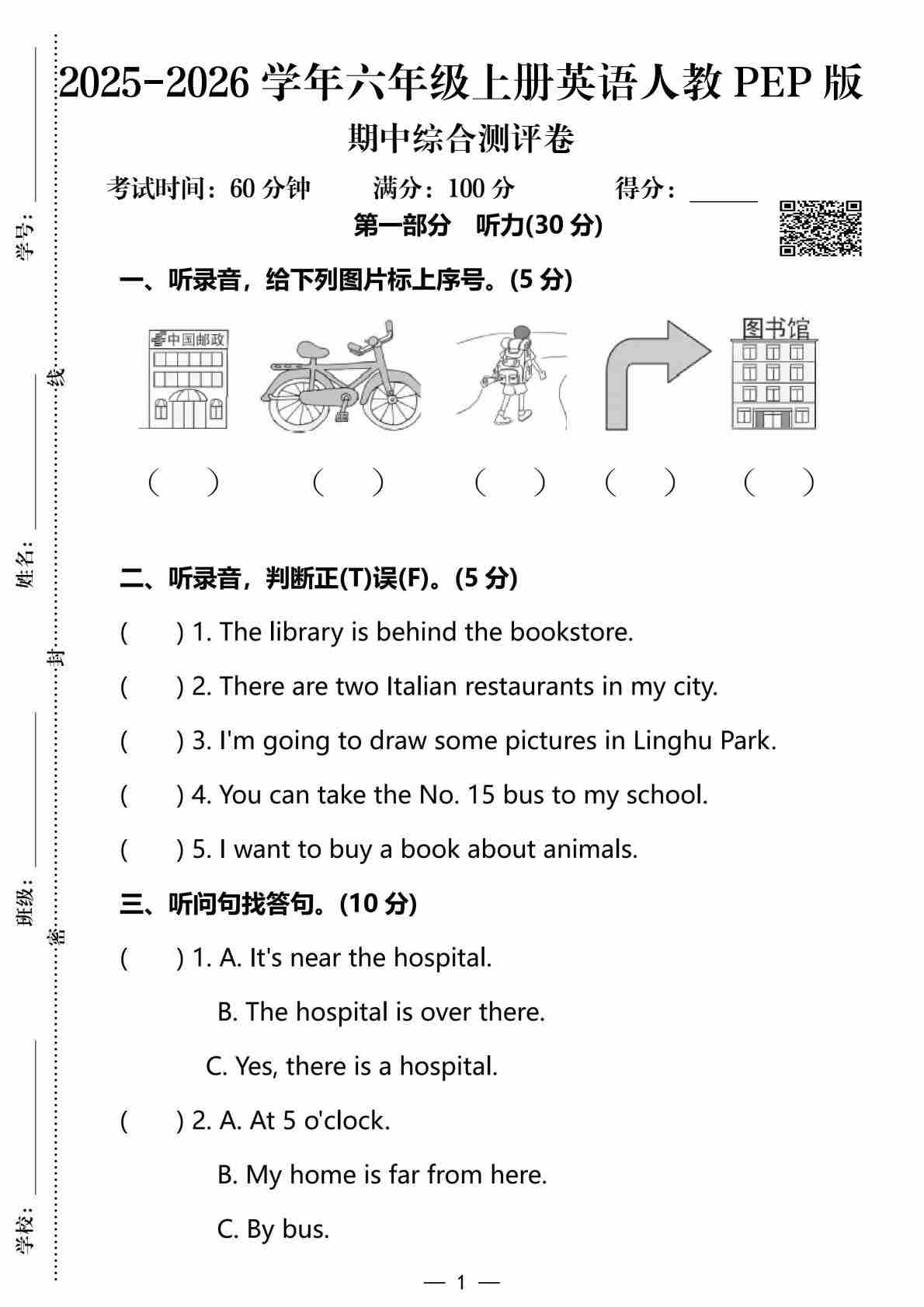 2025-2026学年六年级上册英语人教PEP 版-期中试卷1