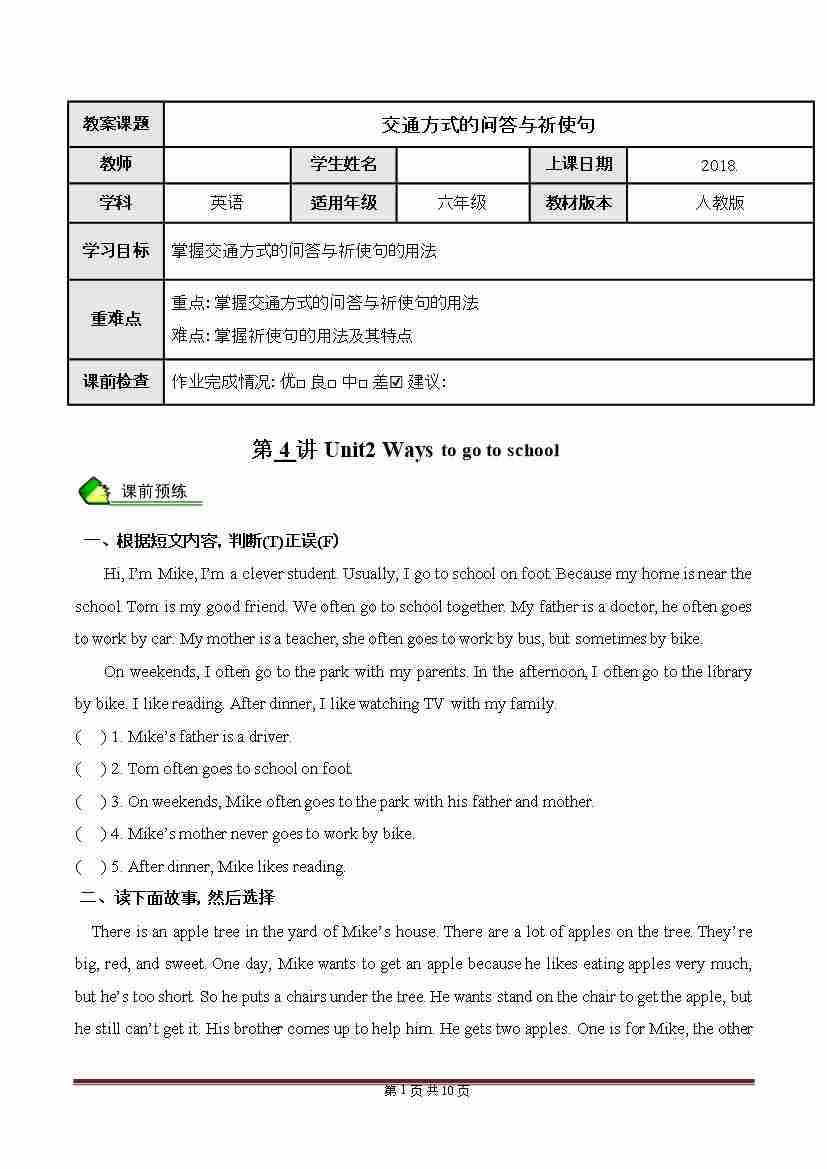 4 PEP4秋季课程六年级第四讲教案 交通方式的问答与祈使句