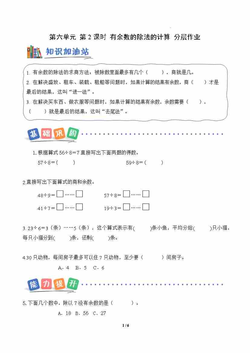 第六单元 第2课时 有余数的除法的计算(分层作业)数学苏教版二年级上册 (新教材)