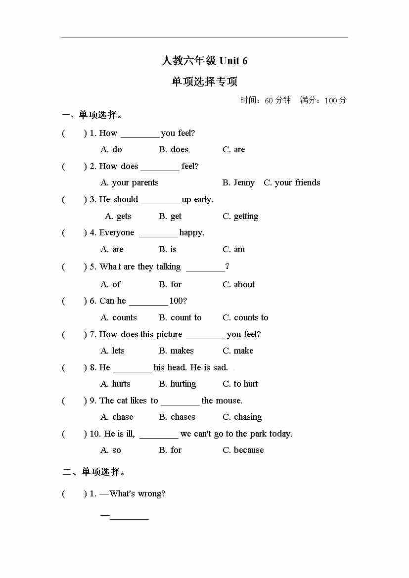 【单元专项训练】六年级上册英语-Unit 6 How do you feel 单选 人教PEP版 (含答案)