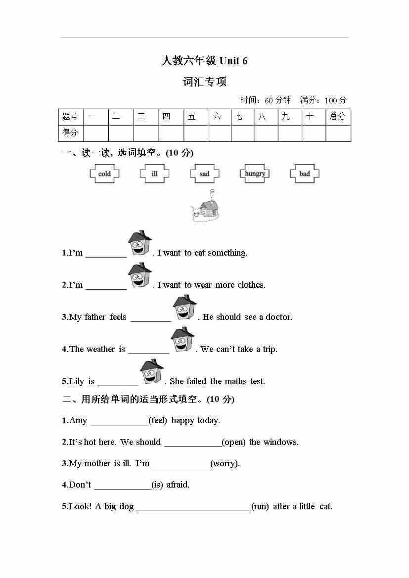 【单元专项训练】六年级上册英语-Unit 6 How do you feel 词汇 人教PEP版 (含答案)