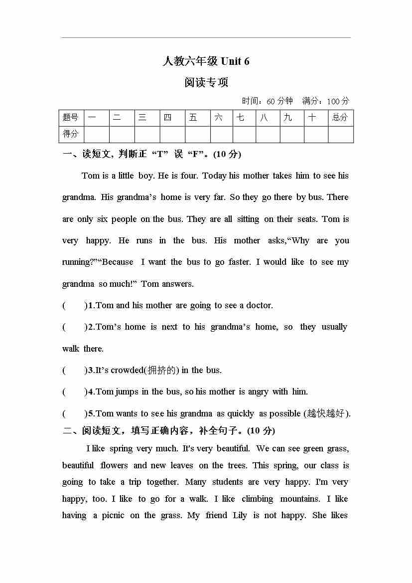 【单元专项训练】六年级上册英语-Unit 6 How do you feel 阅读 人教PEP版 (含答案)