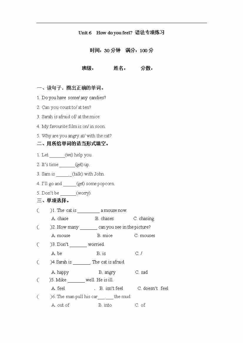 【核心语法】六年级上册英语语法专训 Unit 6 How do you feel 人教PEP(word版,含答案)