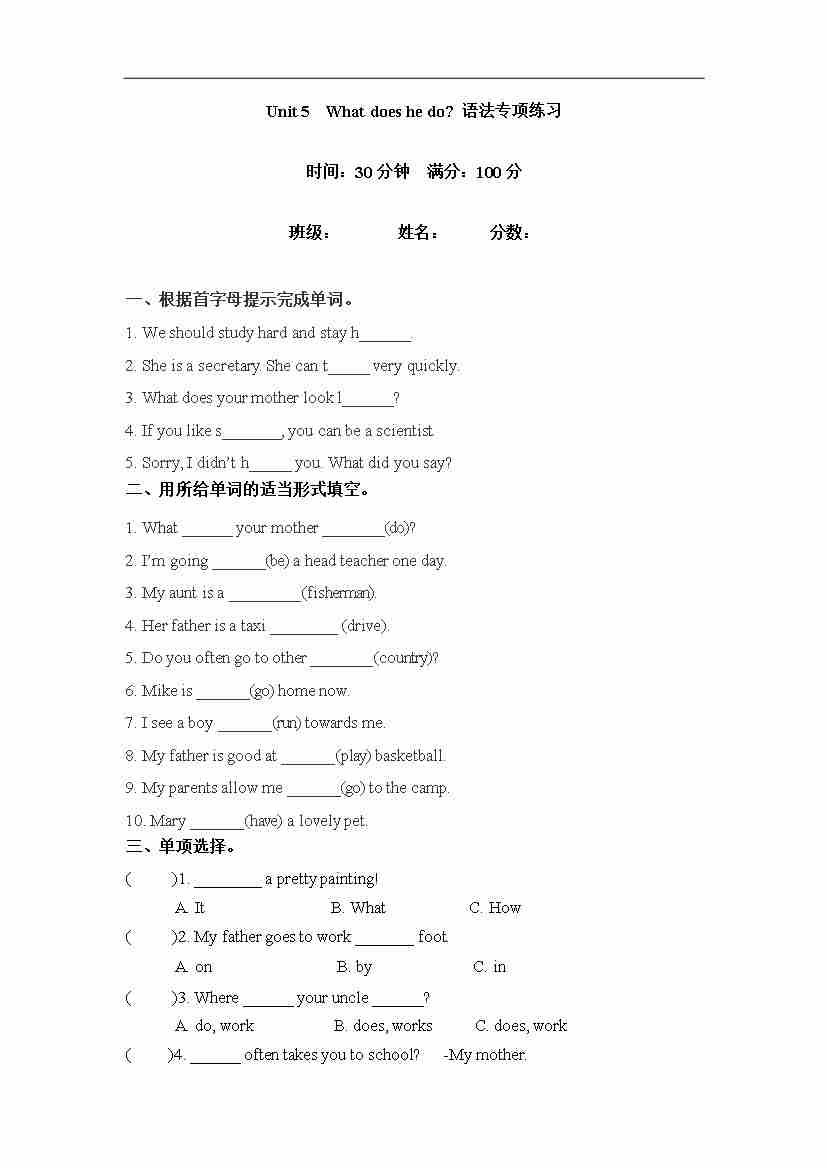 【核心语法】六年级上册英语语法专训- Unit 5 What does he do 人教PEP(含答案)