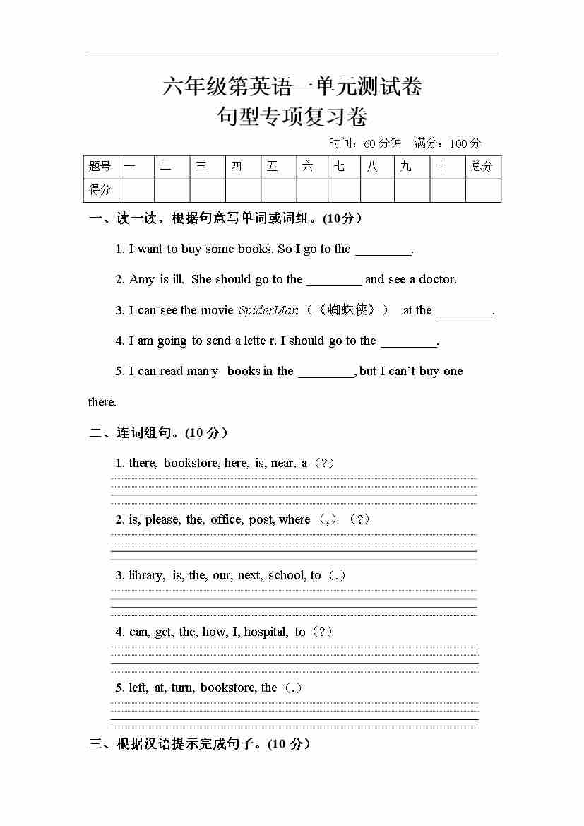 【单元专项训练】六年级上册英语-Unit 1 How can I get there 句型 人教PEP版 (含答案)