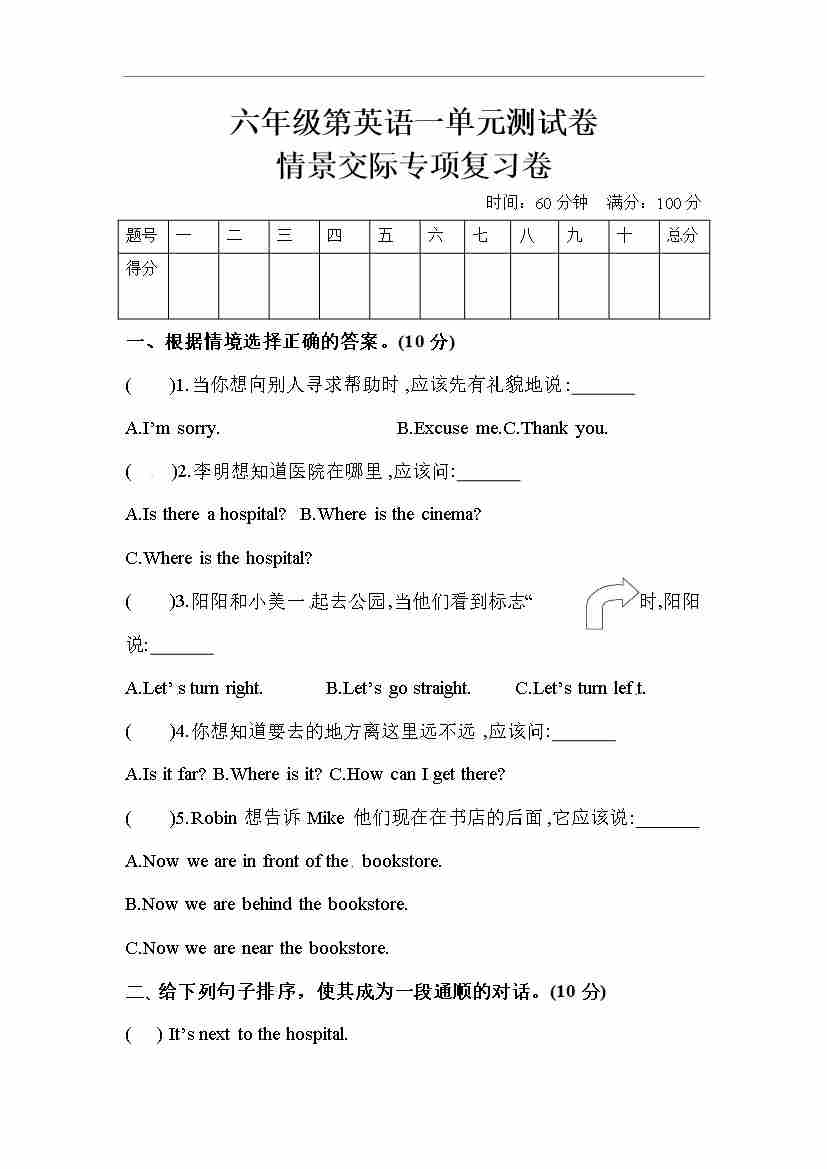 【单元专项训练】六年级上册英语-Unit 1 How can I get there 情景交际 人教PEP版 (含答案)