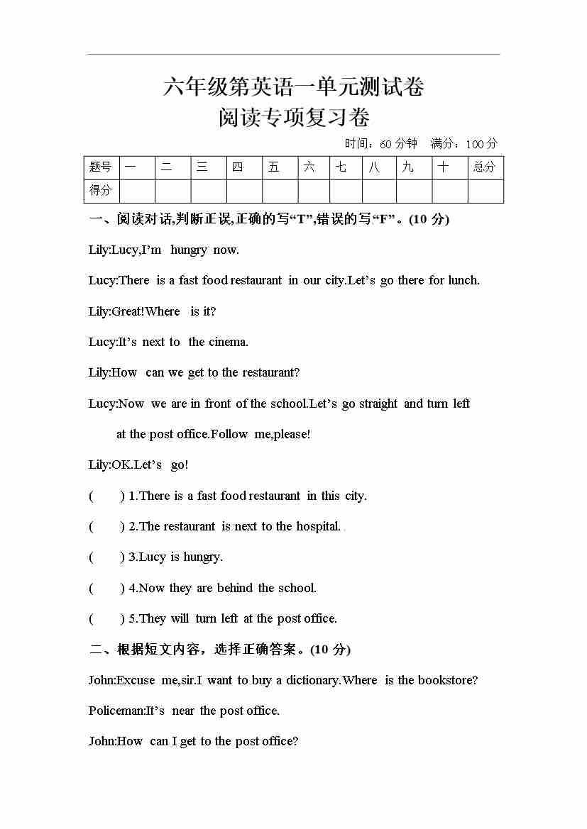【单元专项训练】六年级上册英语-Unit 1 How can I get there 阅读 人教PEP版 (含答案)