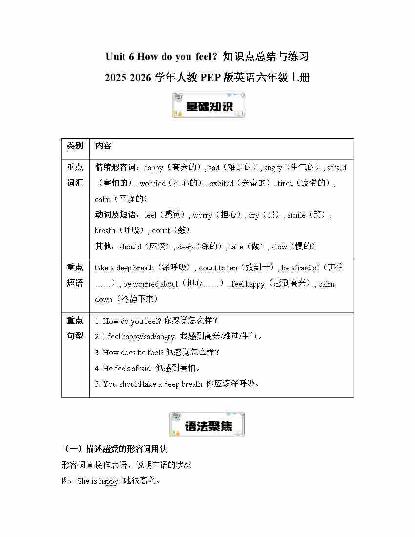 Unit 6 How do you feel?知识点总结与练习 (含答案解析) 2025-2026学年人教PEP版英语六年级上册(1)