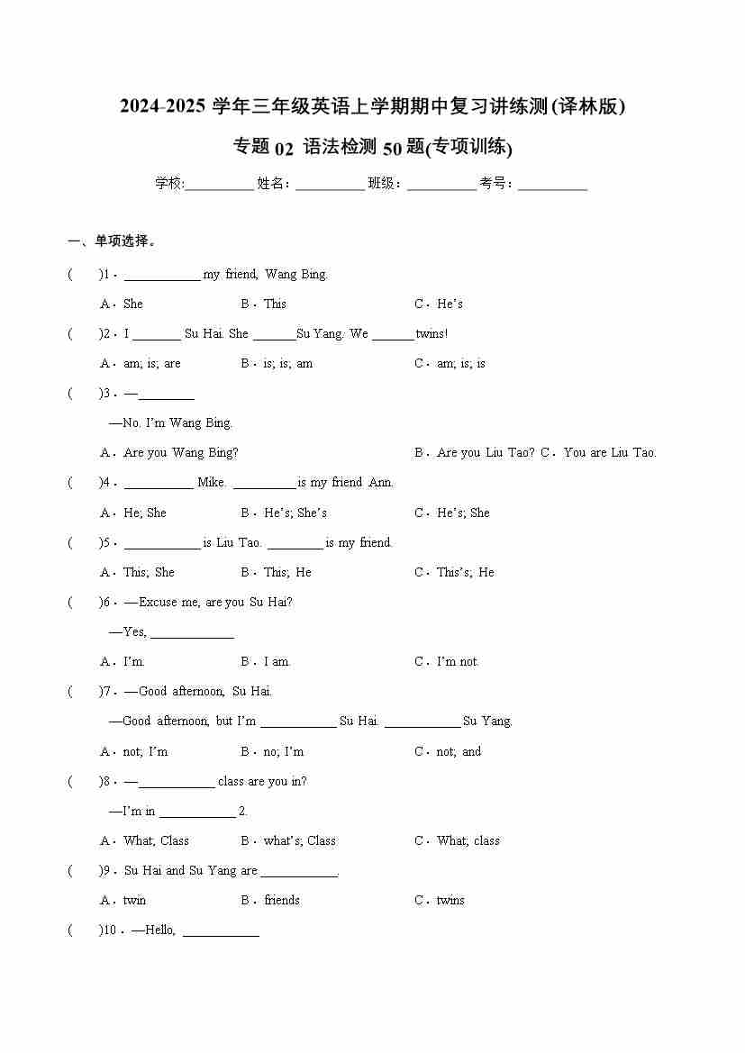 专题02 (语法专项训练)-2024-2025学年三年级英语上学期期中复习讲练测(译林版