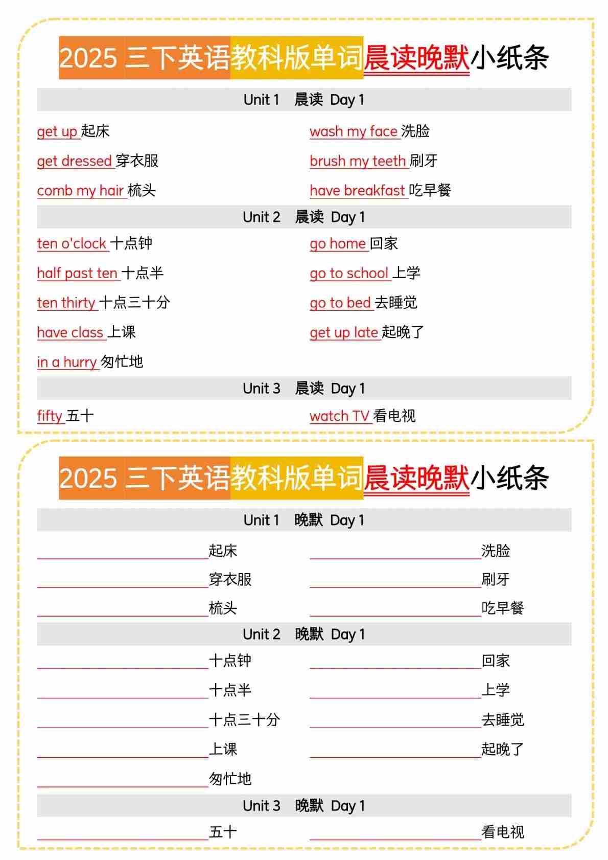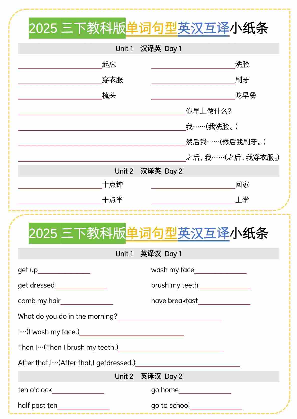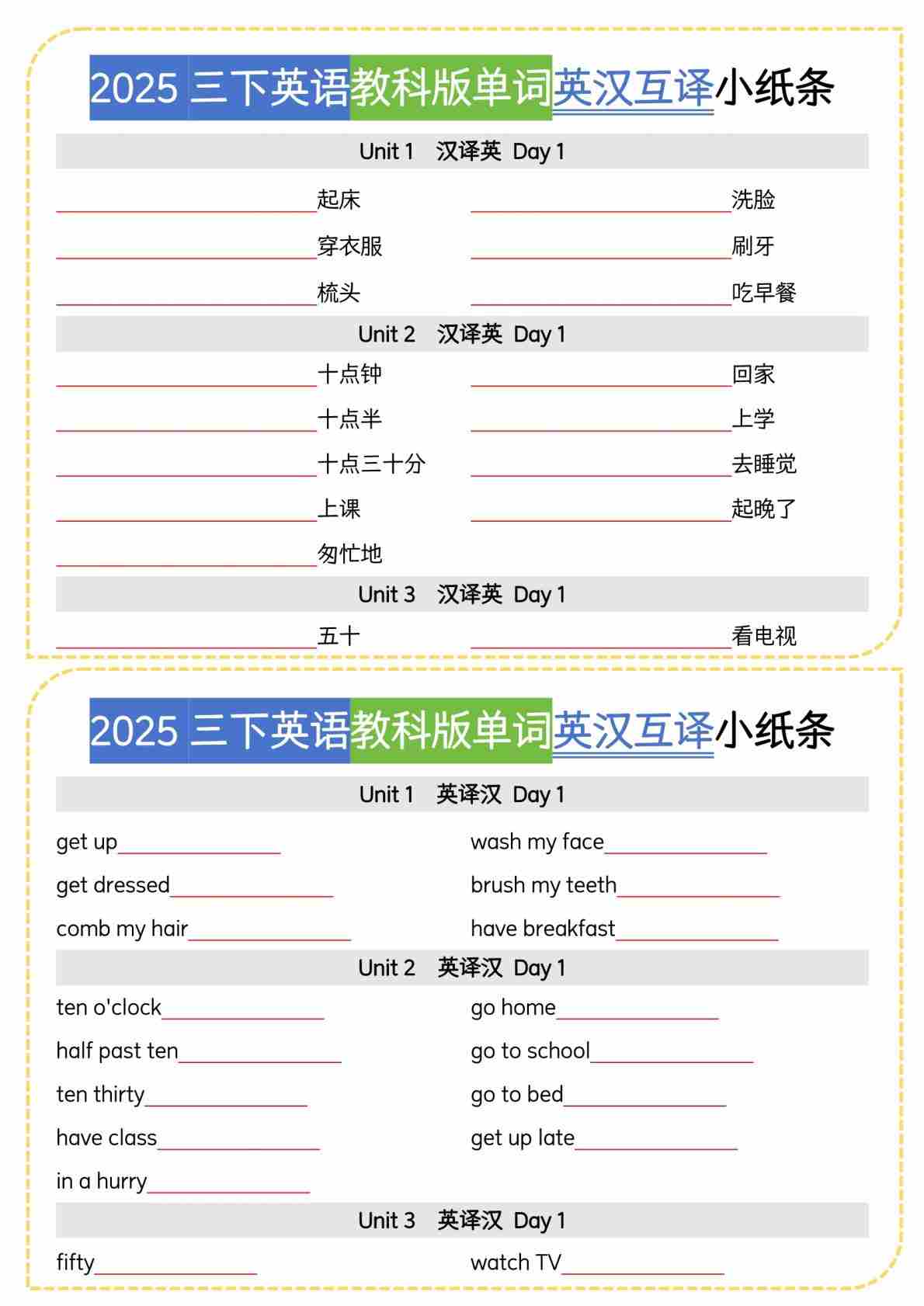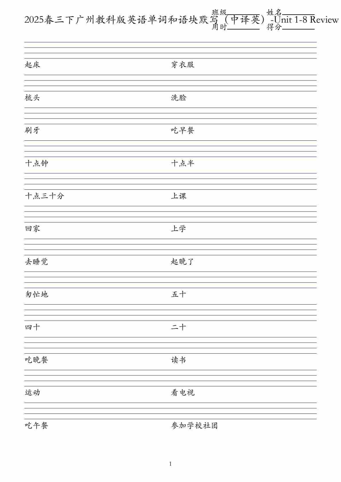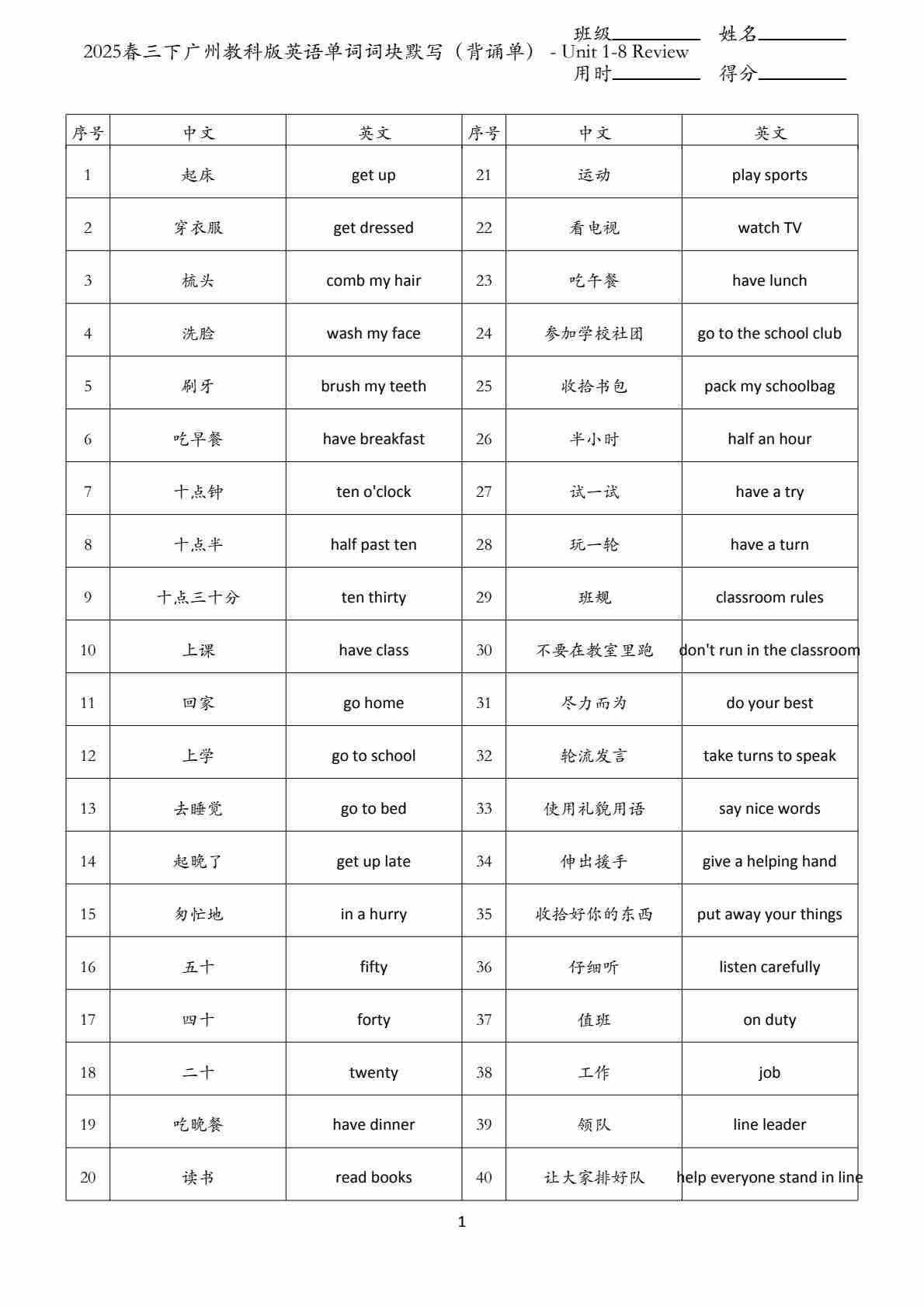 2025春三下广州教科版英语单词和语块默写(中译英)-Unit 1-8