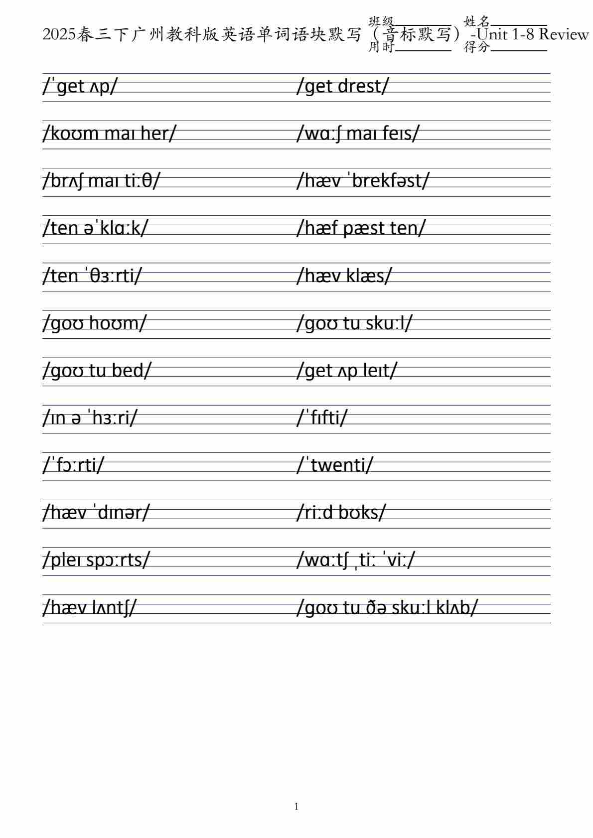 2025春三下广州教科版英语单词语块默写(音标默写)-Unit 1-8