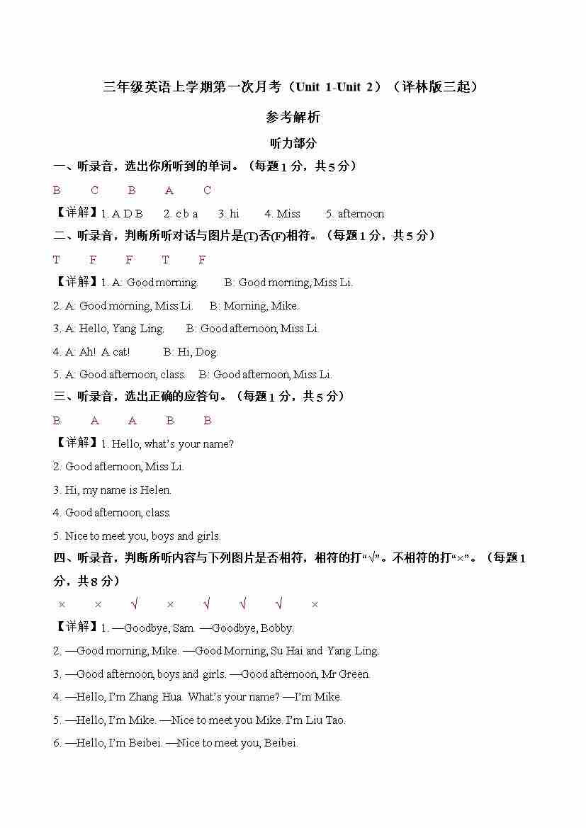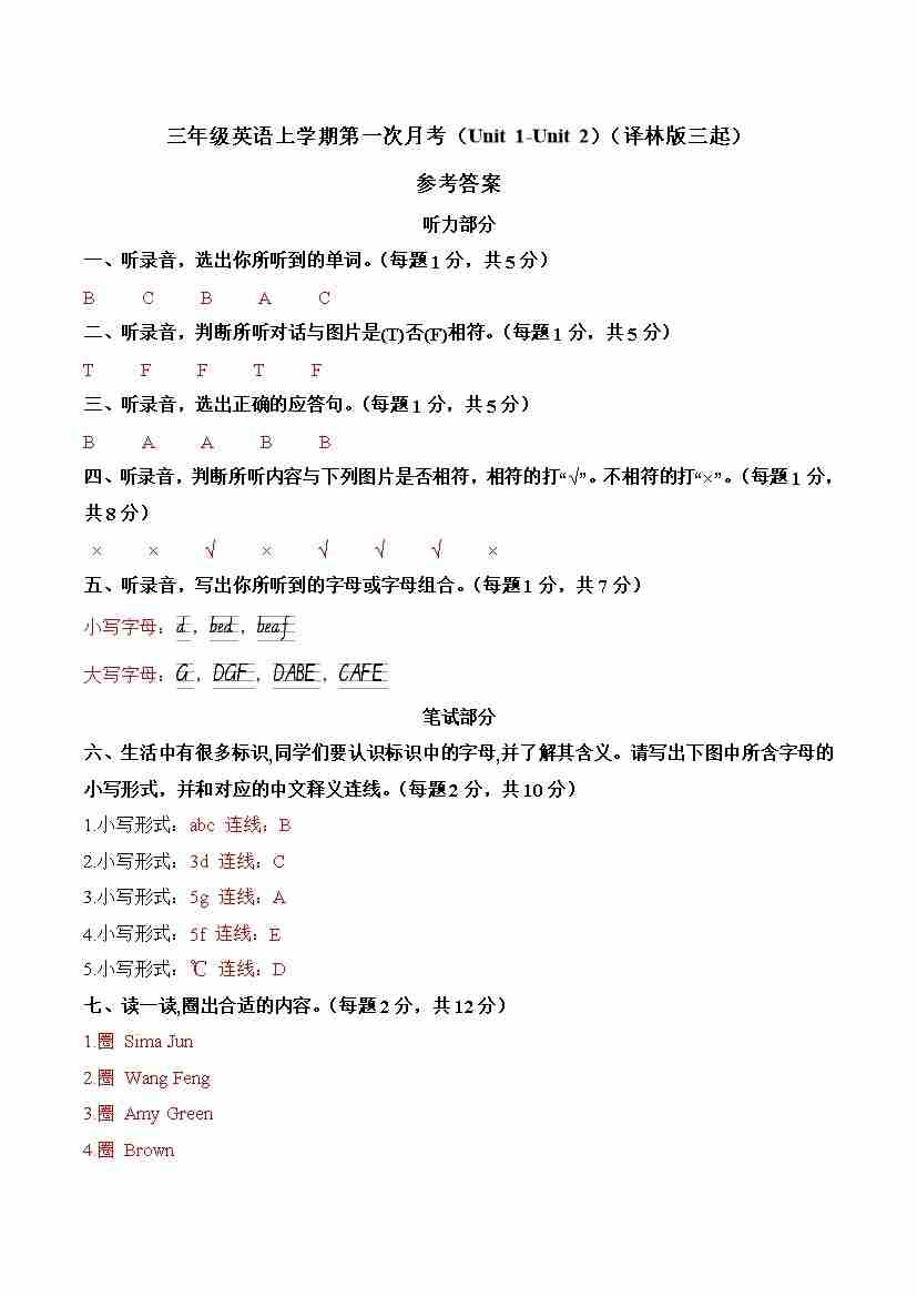 三上译林第一次月考(Unit1-Unit2)(参考答案)