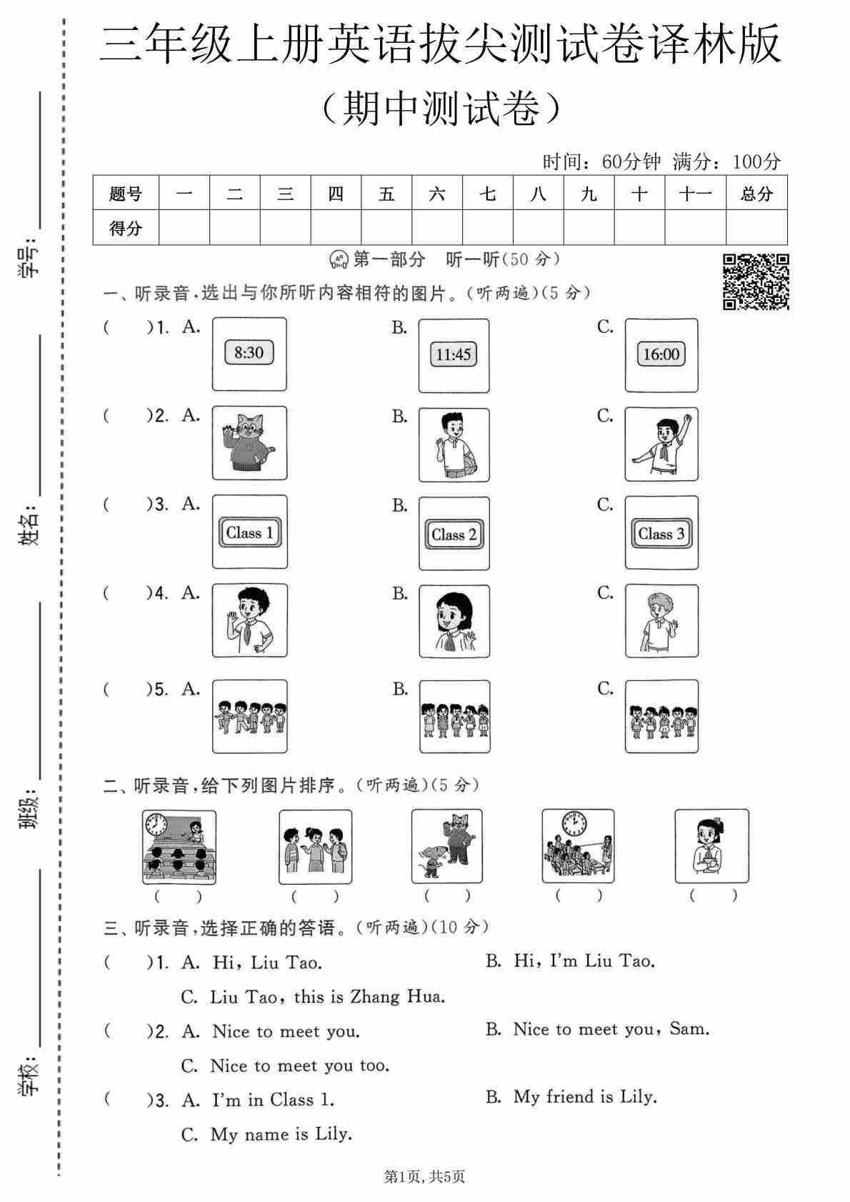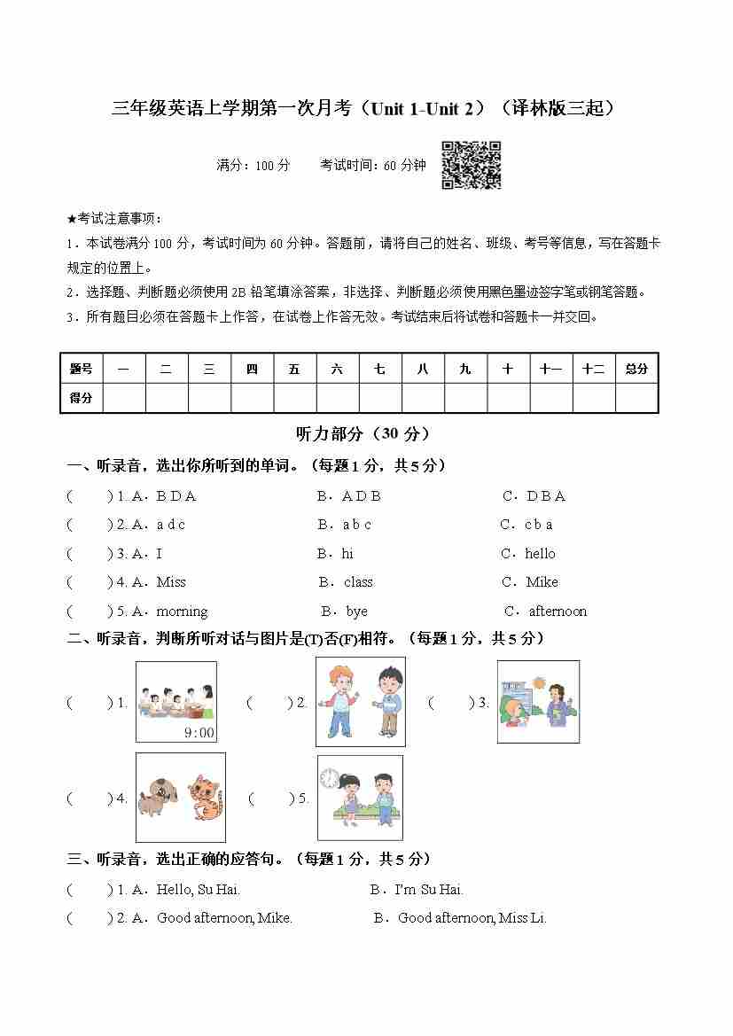 三年级(上)英语 期中测试卷《译林版》