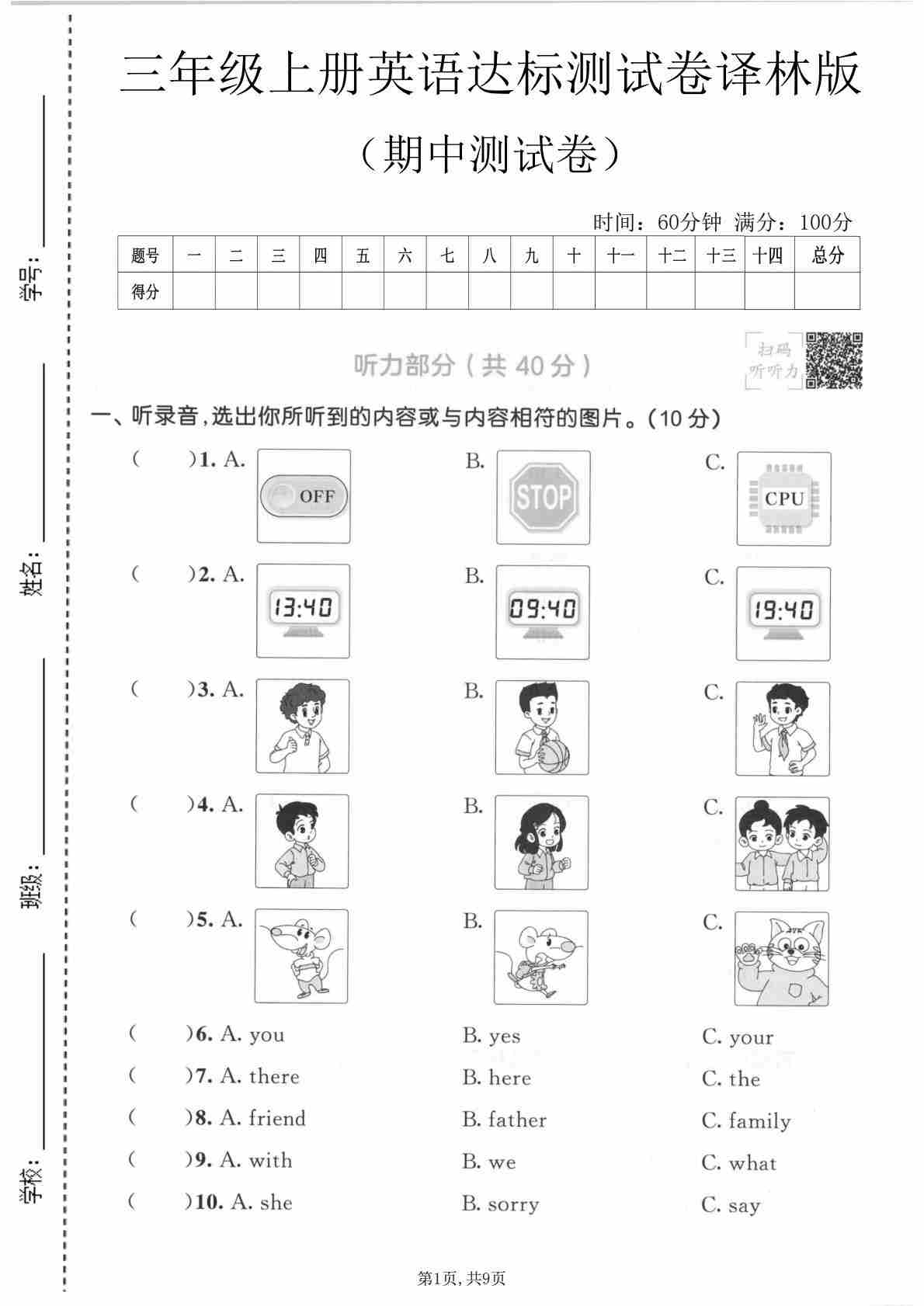 三年级(上)英语 期中达标测试卷《译林版》